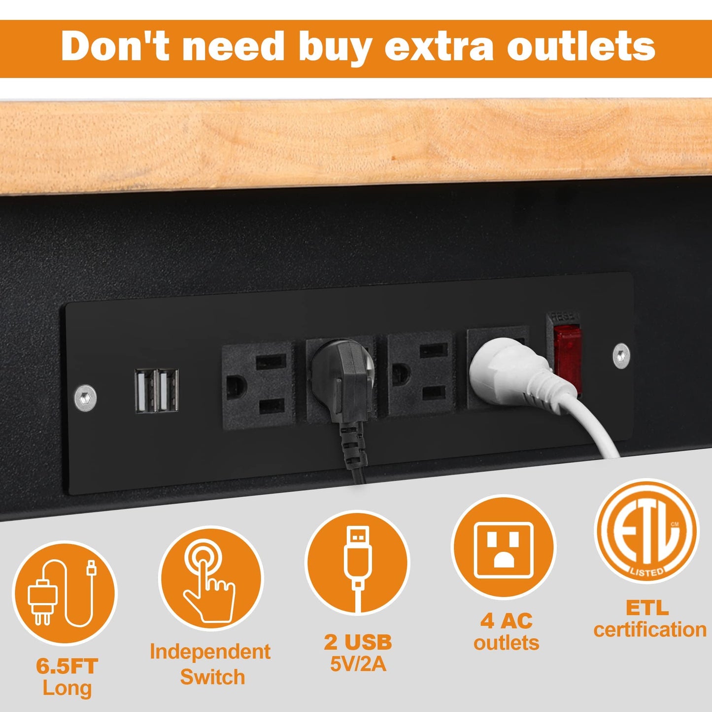 - 【4 AC 2 USB Power Outlets】 The ETL certified power strip has 4 AC Outlets, 2 USB Ports and 1 Switch, with 6.5 ft long Wire, which is safe and durable, making it easy to equip the worktable with various electric tools and lights.