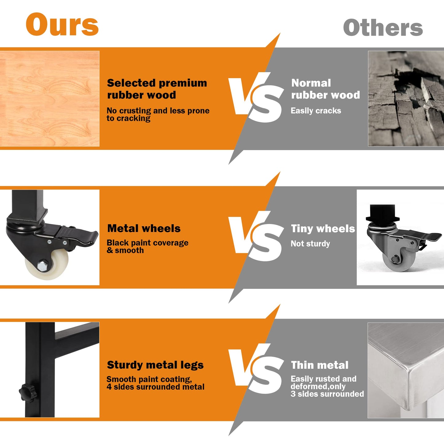 - 【Solid Wood & Reinforcing Rod】 60" x 24" solid rubber wood top with metal frame, the weight load capacity of this heavy duty workbench over 2000 lbs, the extra support rod to make the table more stable horizontally.