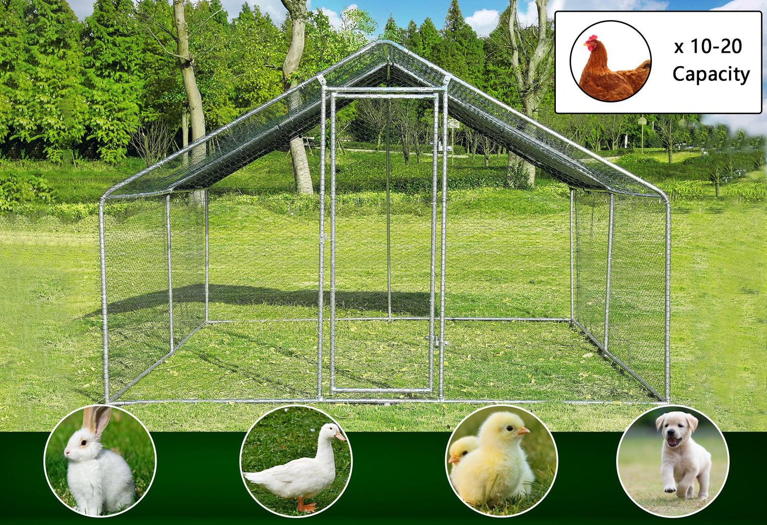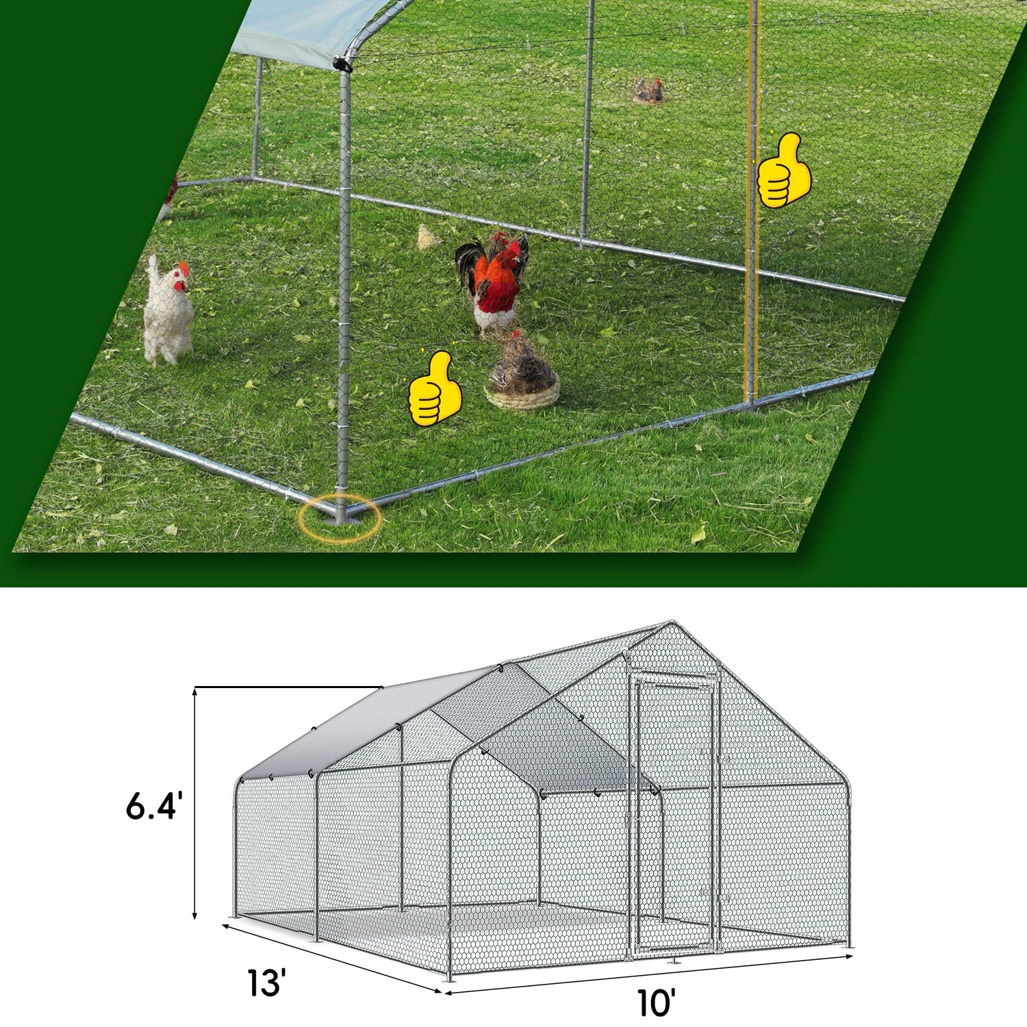 - 🐣【Durable Steel Structure】Our heavy-duty metal coop (13’ D x 10’ W x 6.5’ H) is made of the high-quality steel frame. A large metal coop for long-term use is the point we keep in mind all the time when we produce this product, so we added additional support round spacers. The stainless steel coupled with galvanizing technology resistance of the cage.