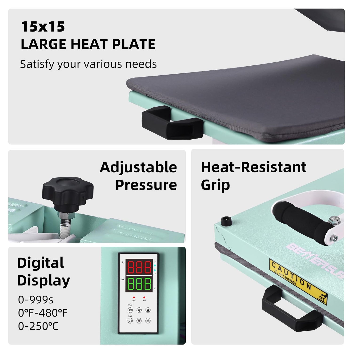 BetterSub 15‘’x15‘’ Industrial Heat Press Machine for T-Shirts, Sublimation, Transfers – Digital LCD Control, Teflon Surface, Clamshell Design, Safe & Durable (Teal)