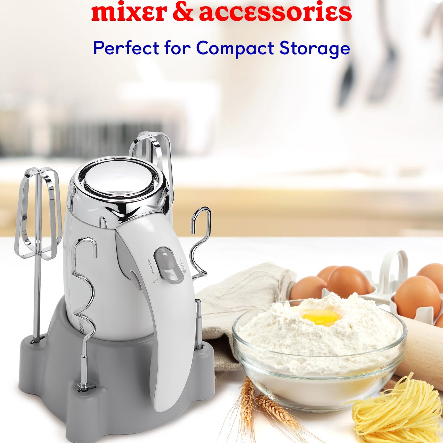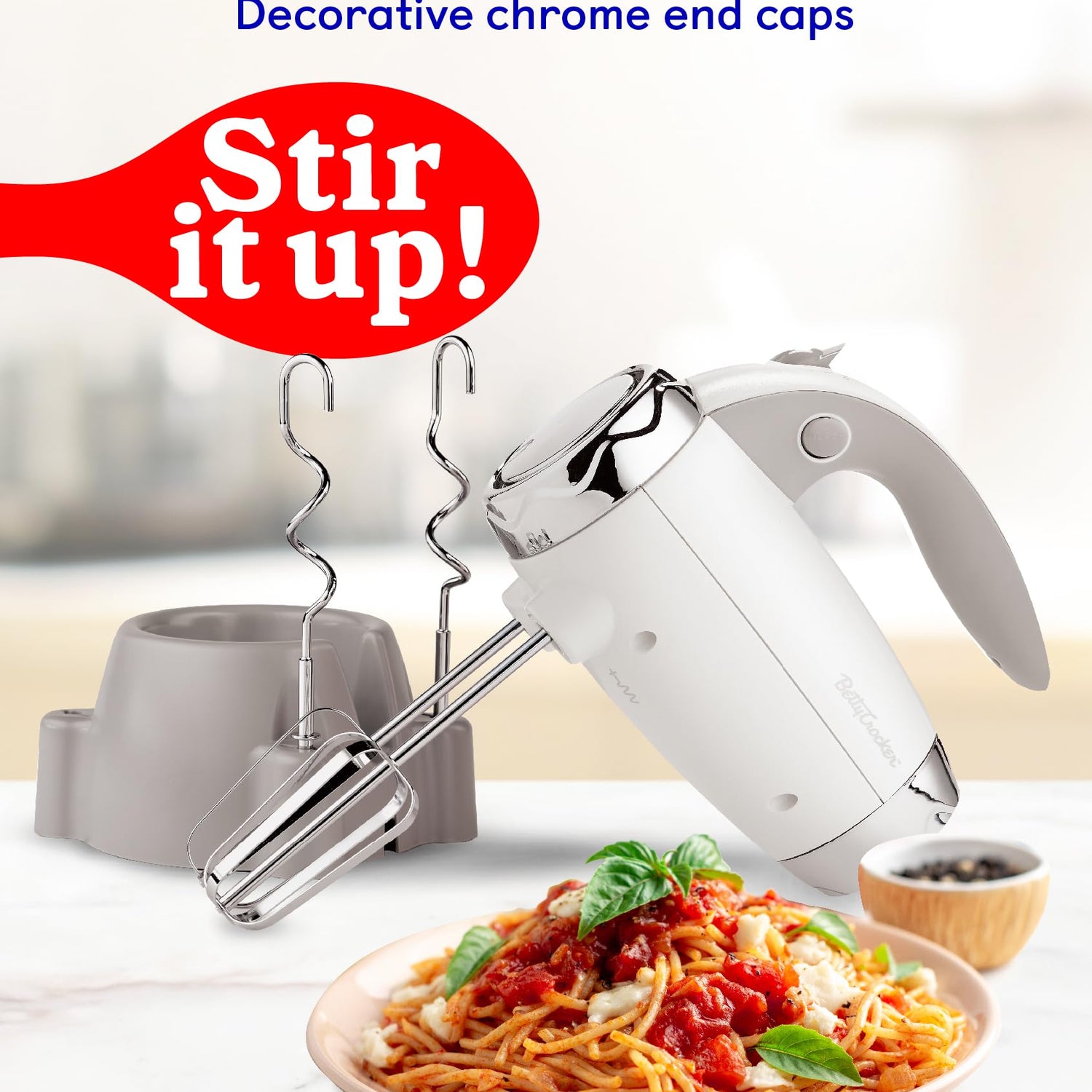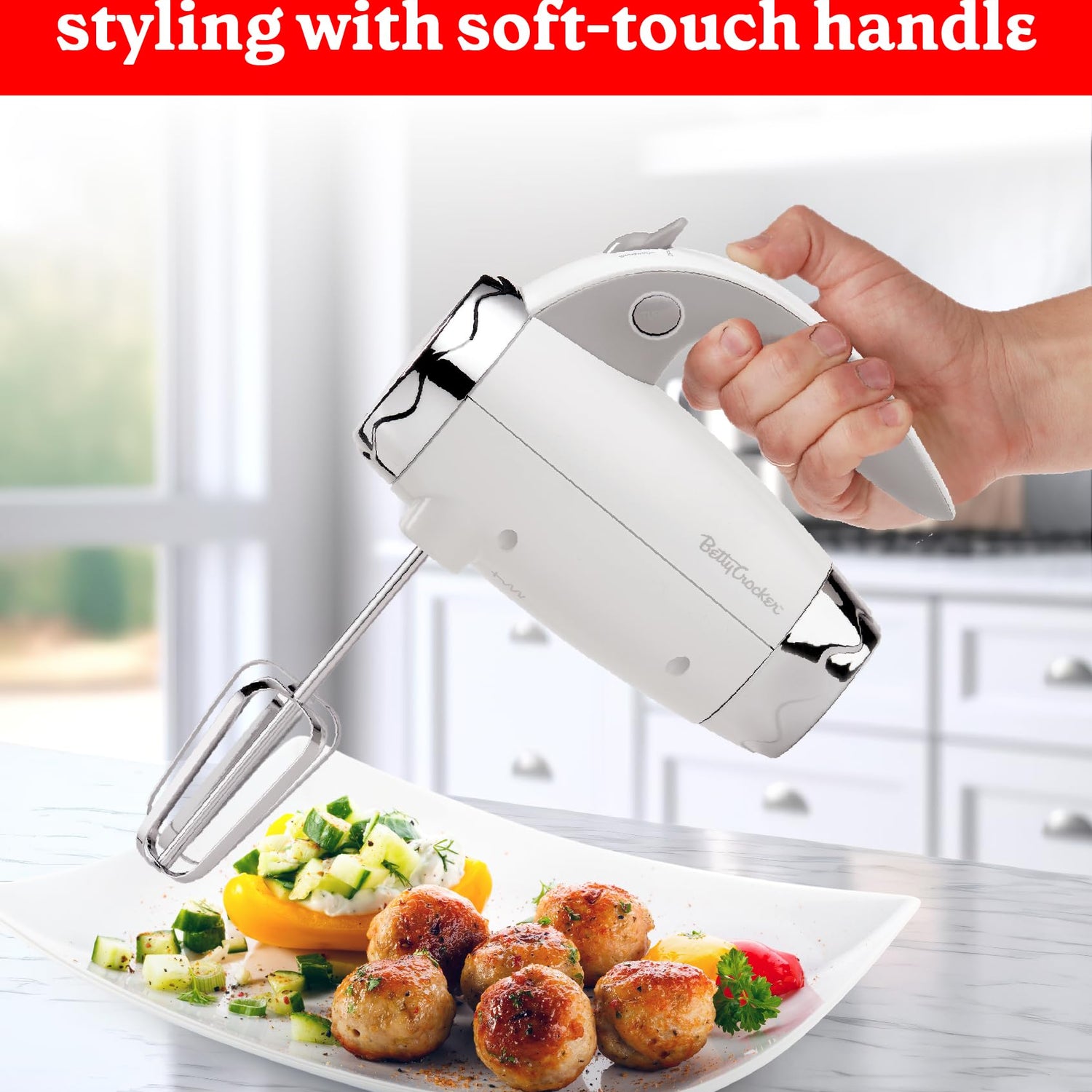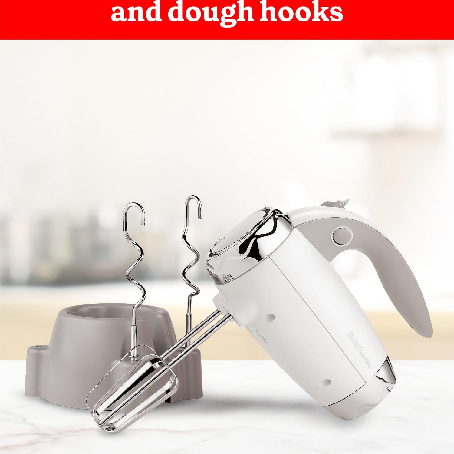 BETTY CROCKER Hand Blender 7 Speed, 250 Watt Electric Mixer with Beaters and Dough Hooks, Ergonomic Electric Hand Mixer for Home & Kitchen with Stand and Soft Touch Handle, White