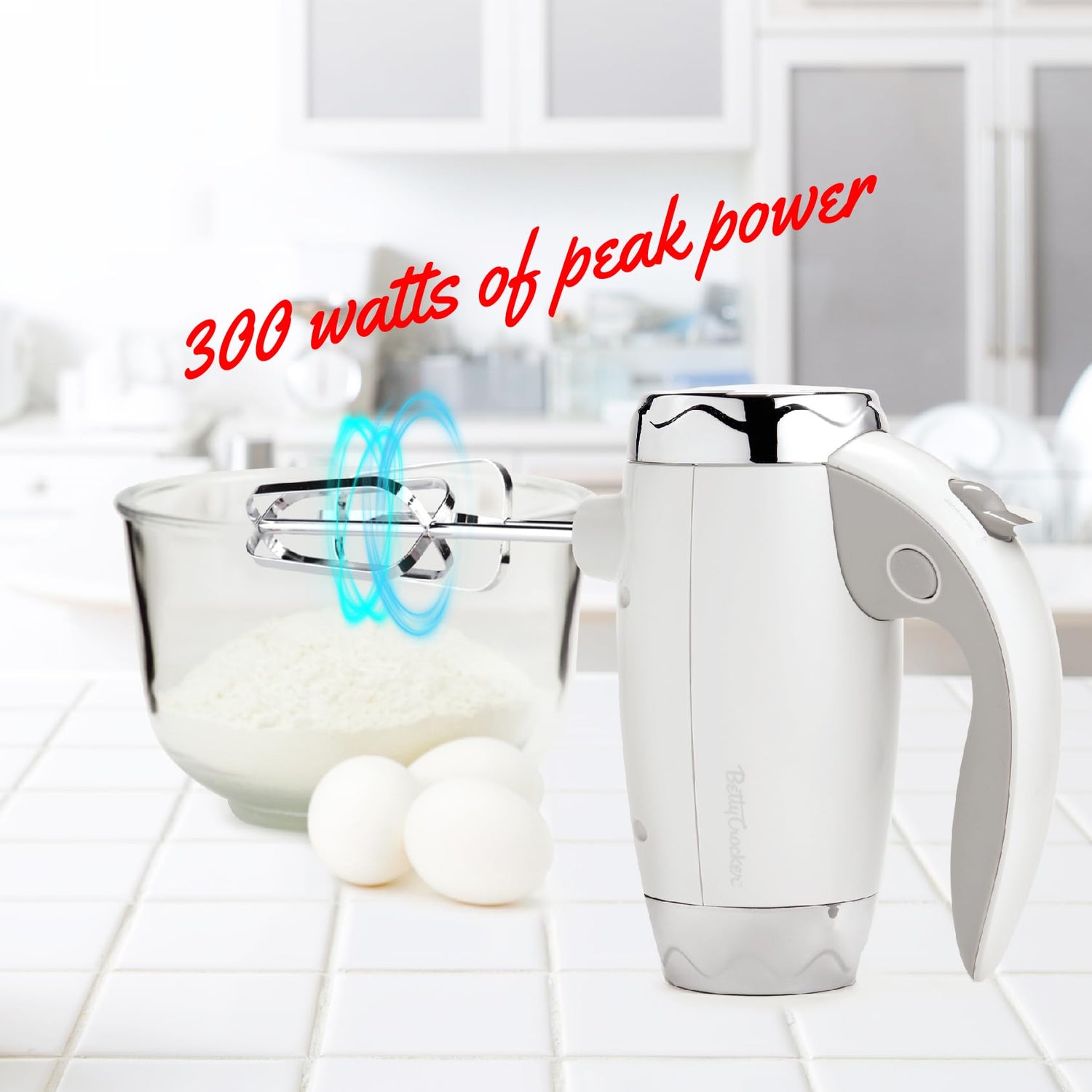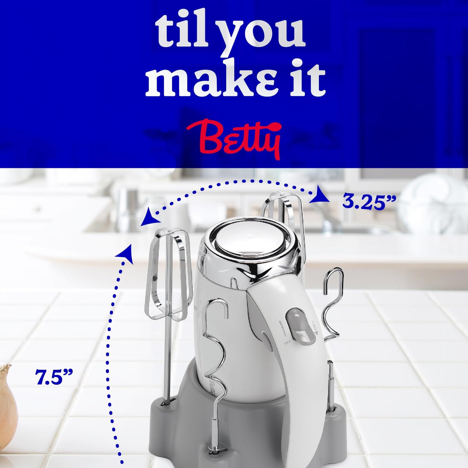 Details: This Betty Crocker 7-Speed Power Up Hand Mixer with Stand in White is your number 1 kitchen sidekick to bake someone happy. When it comes to easy-to-use ergonomic kitchen tools, this handheld electric mixer is your solution to creating mouthwatering dishes, meals, and treats. With 250 watts of power and a turbo 300 watts at peak power, this mixer is considered a top household item for its versatility and easy storage. When it comes to high-quality kitchen appliances, especially hand blenders for kitchen, this mixer comes with necessities like hand mixer beaters and dough hooks. Whether you're using each dough whisk to share the joy of homemade for a special occasion or selecting one of 7 mixing speeds for cake batters, mashed potatoes, or homemade whipping cream, the beaters for the hand mixer ensure thorough and quality mixing each and every time. Also included is a storage stand so you can place your new hand mixer upright when not in use. Easily select your speed thanks to an intuitive speed selector switch and press the beater eject button when finished. When it comes to mixin’ it up, Betty’s got your back.