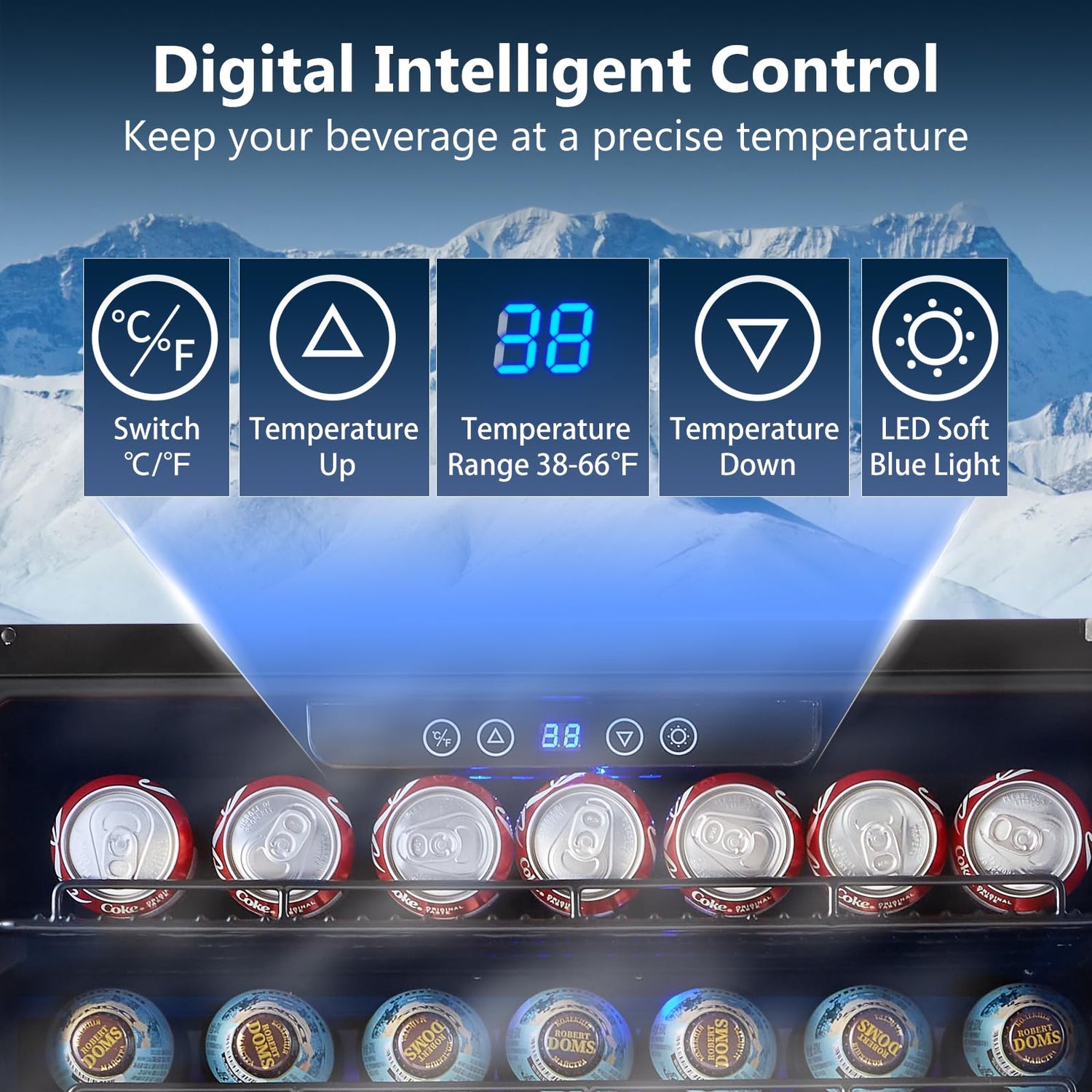 - ★SLEEK DESIGN: This small fridge with Seamless Stainless Steel and transparent glass front with white LED cooler light add elegant design and practical function to your home. This beverage mini refrigerator with single zone temperature control - easy to change the temperature to 38-66°F. It will become one of the highlights in your house.