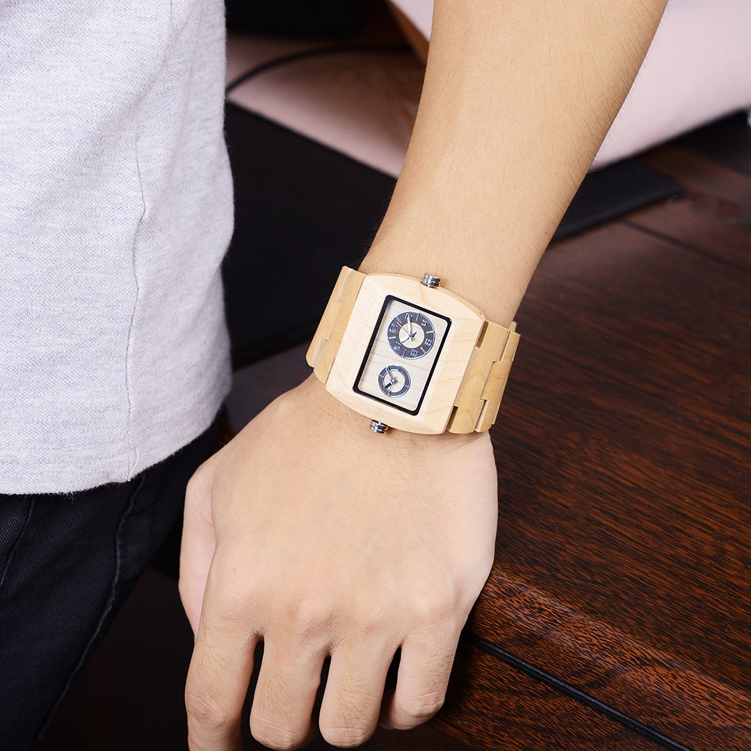 BEWELL Wooden Watch, Square Dial Dual Time Display Quartz Wood Watches for Men