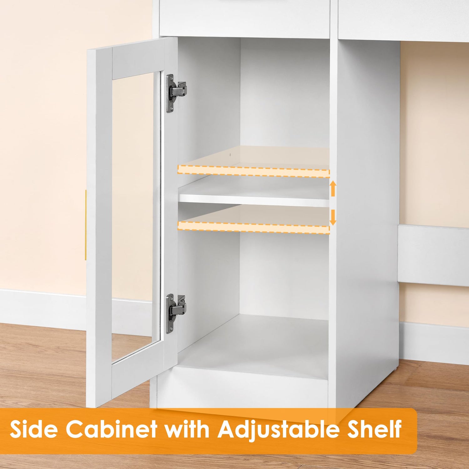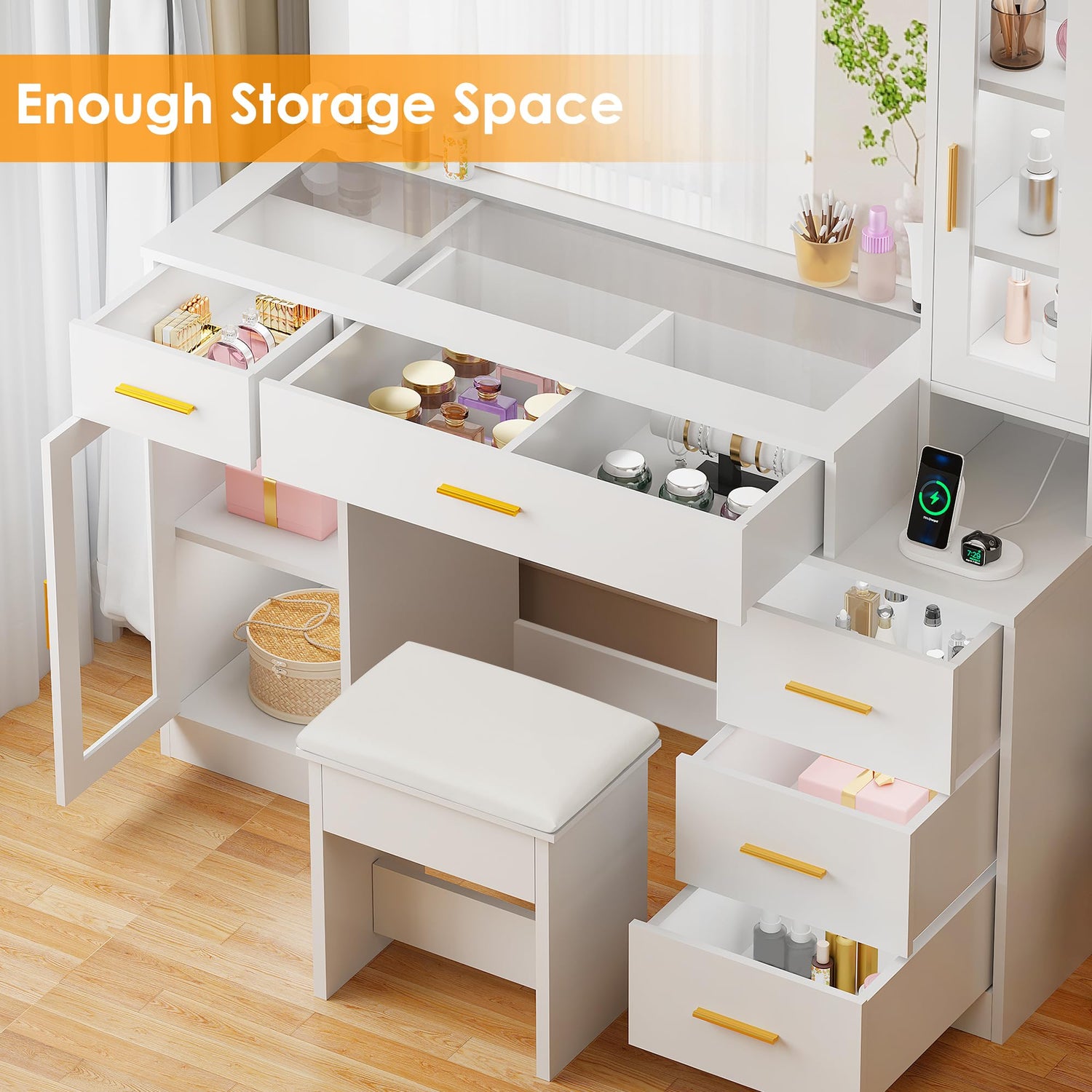 - 【POWERFUL STORAGE CAPACITY】The 49.2" large makeup vanity offers ample storage capacity. Its spacious tabletop and glass cabinets provide sufficient space for your frequently used makeup items. The dressing table has 5 drawers and 2 side cabinet, which can easily accommodate all your belongings. The white vanity glass top drawer, not only allows for DIY drawer dividers but also enables you to quickly locate the makeup or jewelry you desire