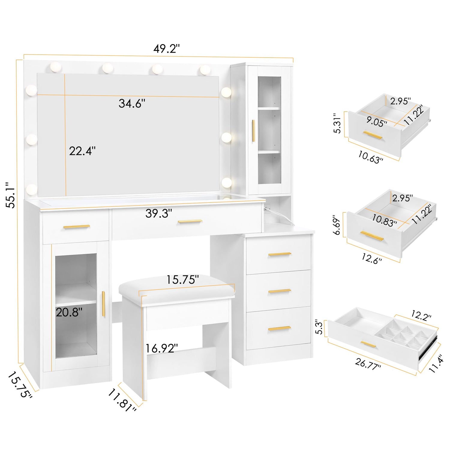 - 【STYLISH DESIGN VANITY DESK】The classic modern design large vanity desk Made of sturdy materials. The white vanity desk includes a glass top, 5 drawers, 2 Glass Cabinets, a lighted mirror, a built-in power strip, and a soft cushioned stool. This makeup table enhances the warmth and comfort of your home and bedroom more warm and comfortable. Vanity set overall dimensions: 49.2" L x 15.75" W x 55" H