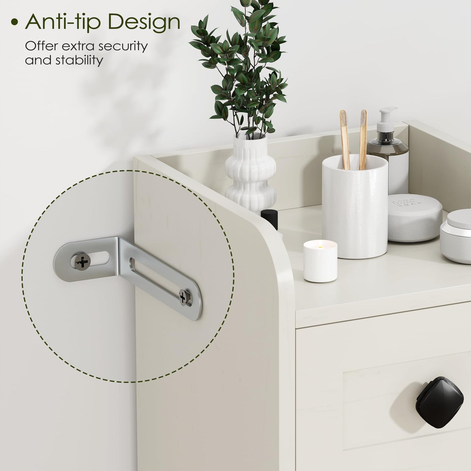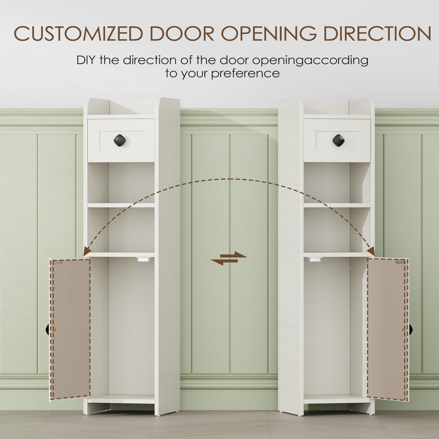 - [MULTIPLE STORAGE OPTIONS] : The door of each cabinet can be attached on the left or right. Top compartments for toiletries, drawers for valuables cell phones, perfume, watches, etc. The middle compartment can hold towels bath towels, and the bottom cabinet can hold toilet paper, garbage bags and other reserve items