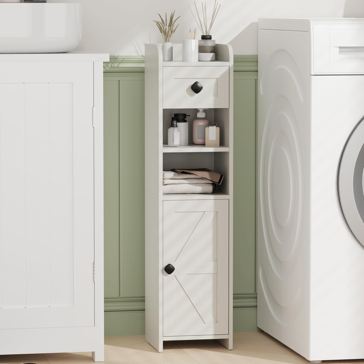- [MULTIPLE STORAGE SPACES] : Small bathroom cabinet has 3 storage compartments including open shelves, 1 smooth sliding drawer and 1 door. The 7.9“ W * 7.9” D * 31.5" H Narrow Storage Cabinet fits perfectly in narrow spaces and Increased space utilization.Whether it's shampoo and body care products, or bath towels and washcloths, this storage space holds it all, keeping your bathroom organized and making life easier from there