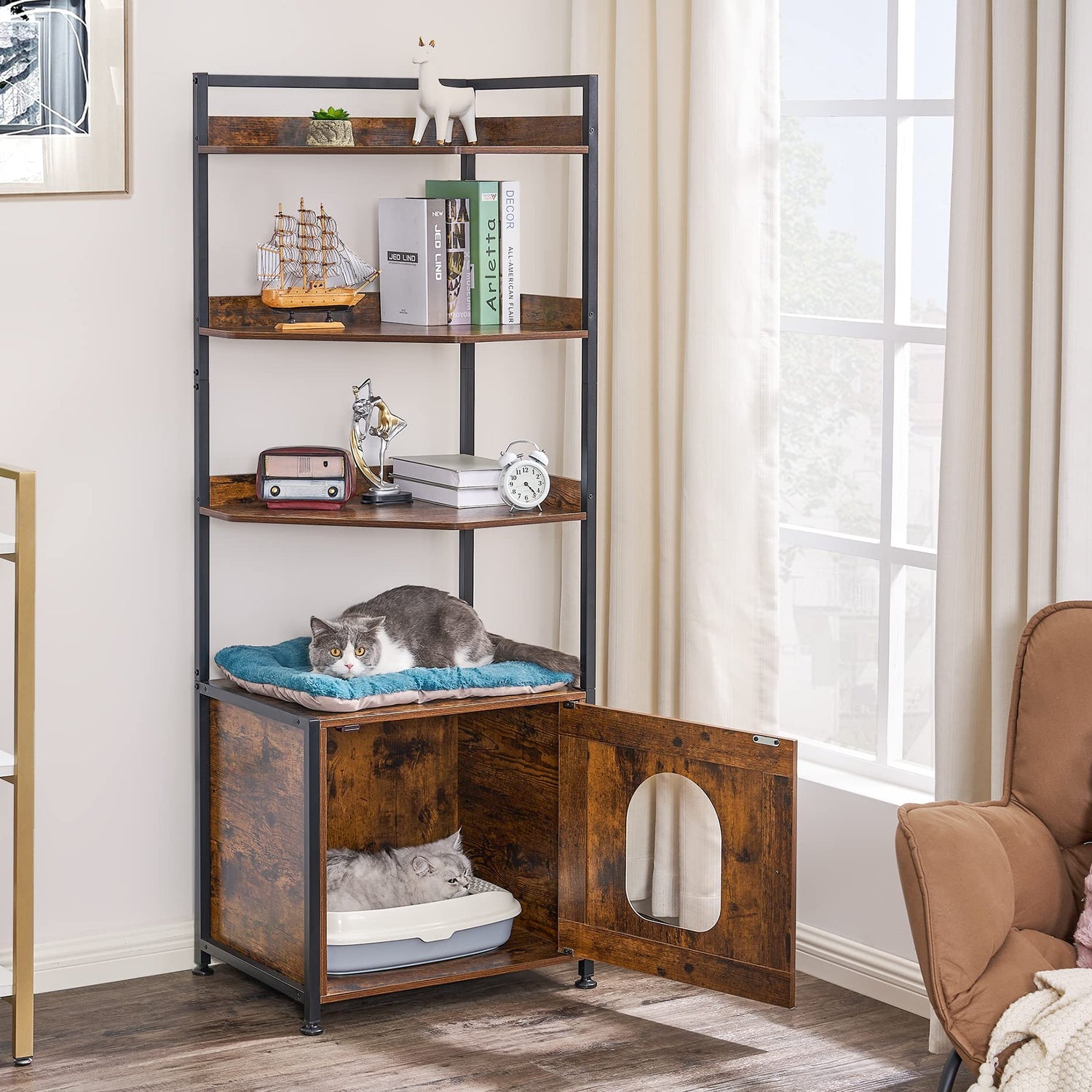 - Multi-Functional Design: This litter box enclosure with shelves features 4-tier storage, ideal for displaying photos, plants, or storing cat essentials discreetly. The lower compartment serves as a hidden cat litter box cabinet, ensuring mess and odor are contained for a cleaner, fresher home.