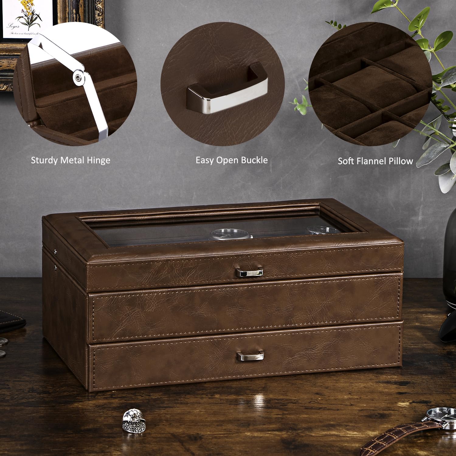 BEWISHOME Watch Box for Men Luxury Watch Organizer Faux Leather Watch Case with Jewelry Drawer, Real Glass Top, Metal Hinge, Brown SSH12Z