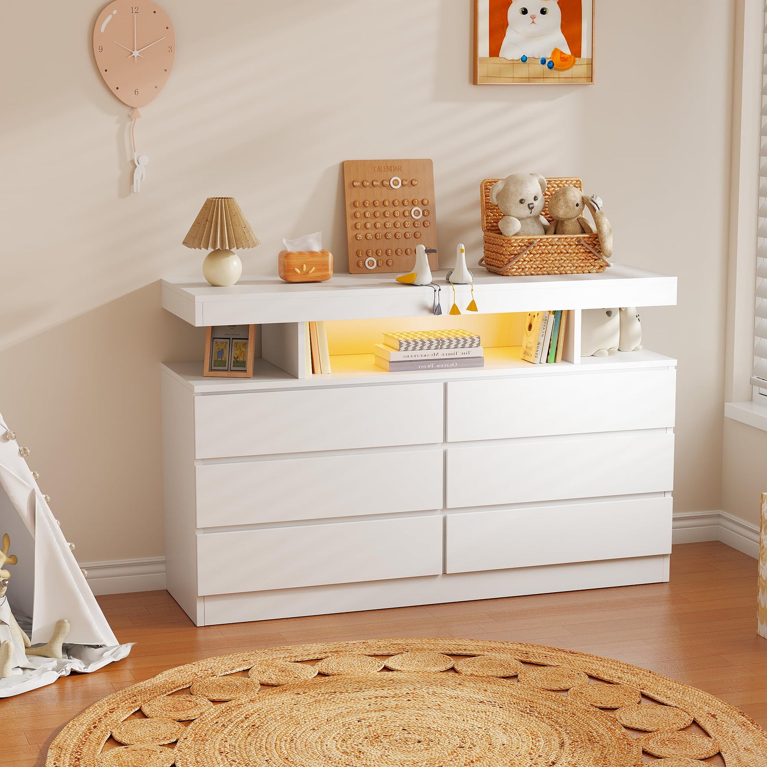 BEWISHOME White Dresser for Bedroom with Charging Station and LED Lights, 6 Drawer Dresser Chests of Drawers, Wood Dresser for Closet, Modern Wide Dresser with Open Space, TV Stand, White KCG02W