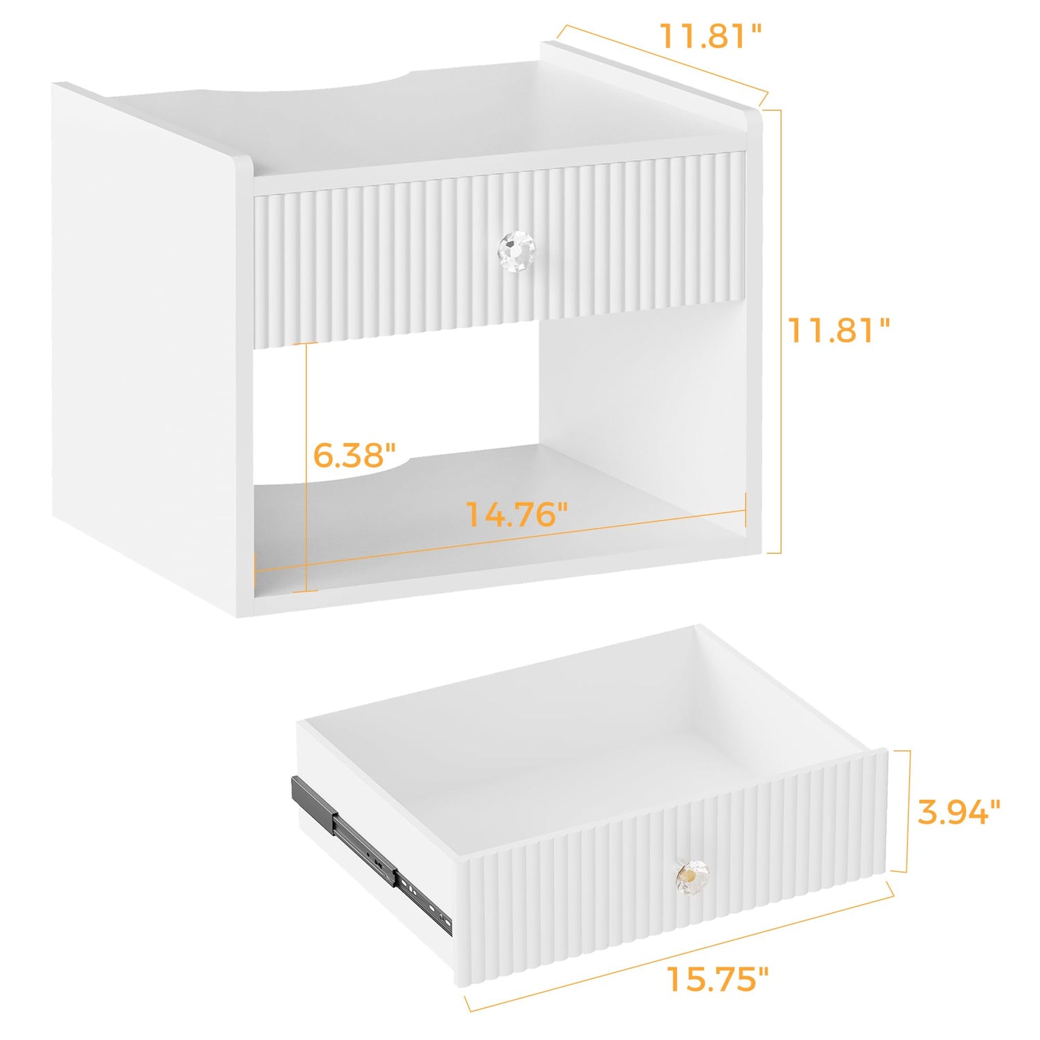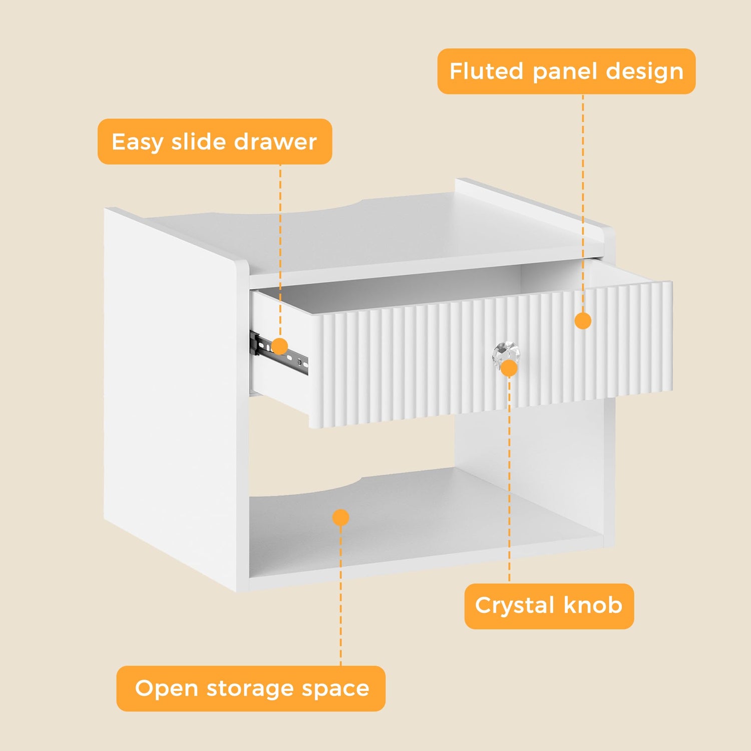 - AMPLE STORAGE SPACE: This floating side table features a stylish fluted drawer and an open compartment, providing convenient storage for your favorite books and magazines. The drawer is perfect for keeping your belongings hidden away for added privacy. With a sturdy construction that supports up to 50 pounds, you can easily store all your essentials and cherished items