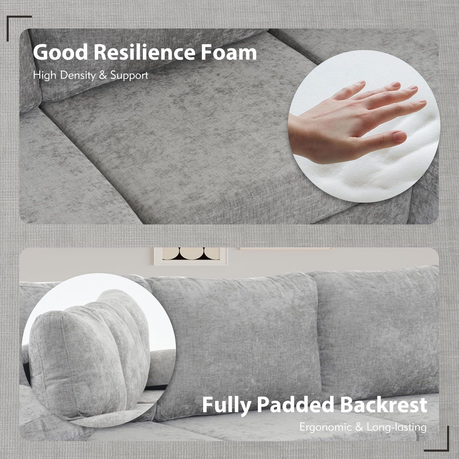 - 【COMFORT CHENILLE FABRIC&SOFT FOAM】This living room couch is upholstered in high-quality chenille fabric that is soft, skin-friendly, and comfortable to the touch. It’s thick, wear-resistant, and durable, designed to resist deformation. The spring support and high-density foam keep the sectional couch plush and supportive, maintaining its shape over time. The covers of this home sofa are easily removable and can be quickly cleaned in the washing machine.