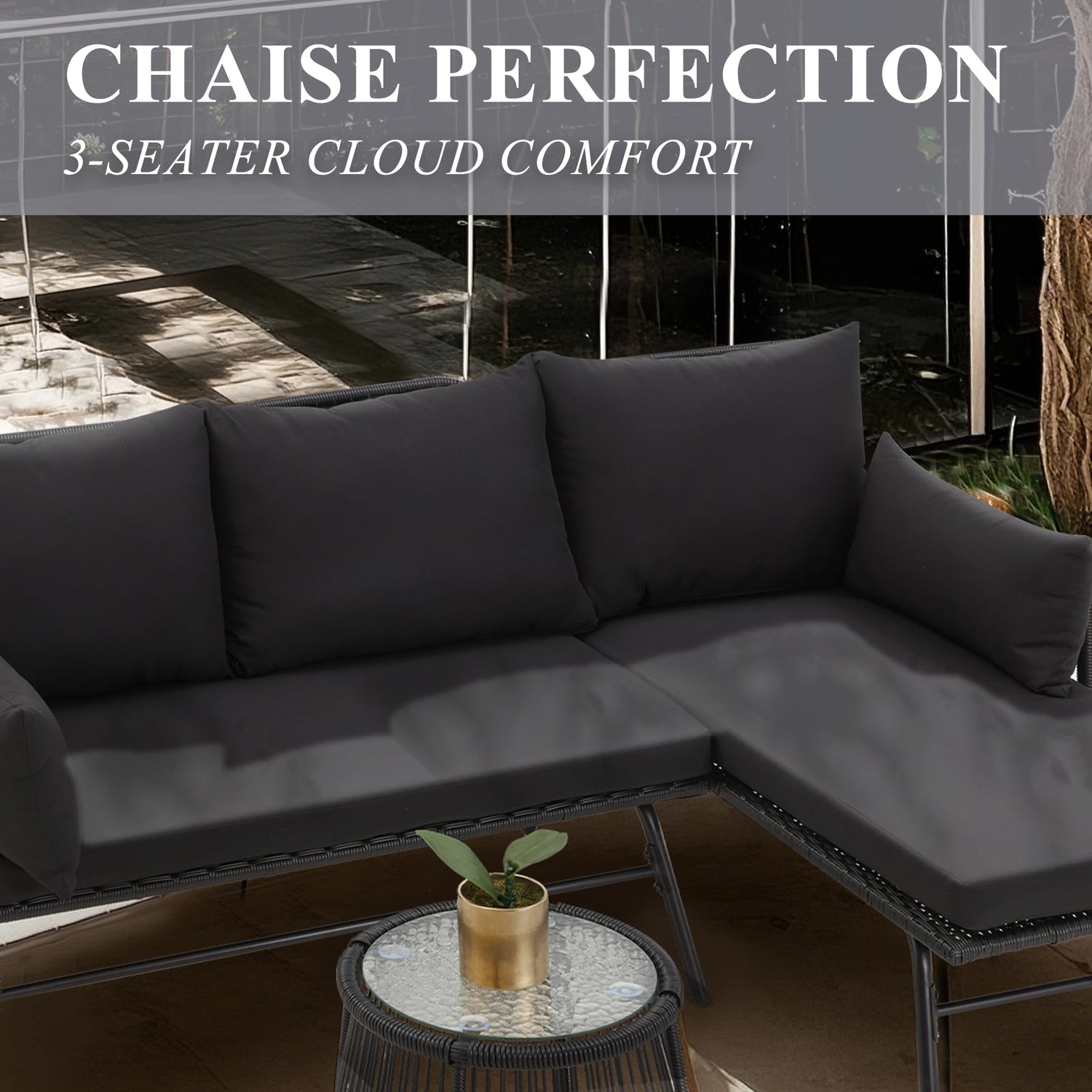 Bezseller 3-Piece Outdoor Patio Furniture Set – L-Shaped Rattan Sectional Sofa with Detachable Lounger, Glass Coffee Table & 4" Cushions – All-Weather PE Wicker for Backyard, Porch, Poolside