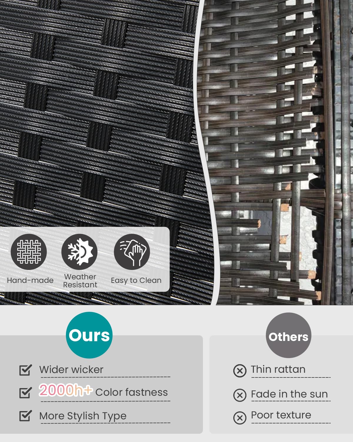 - Sturdy and Durable Construction: Our outdoor patio furniture set crafted with a high-quality, powder-coated steel frame and handwoven PE rattan, this set is designed for longevity and durability. It is rust-proof, weather-resistant, and suitable for outdoor use. Each chair supports up to 250 lbs, ensuring a strong and stable seating experience