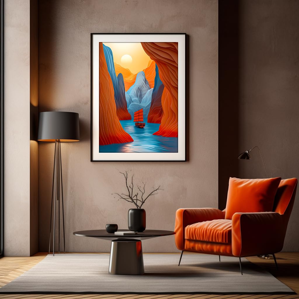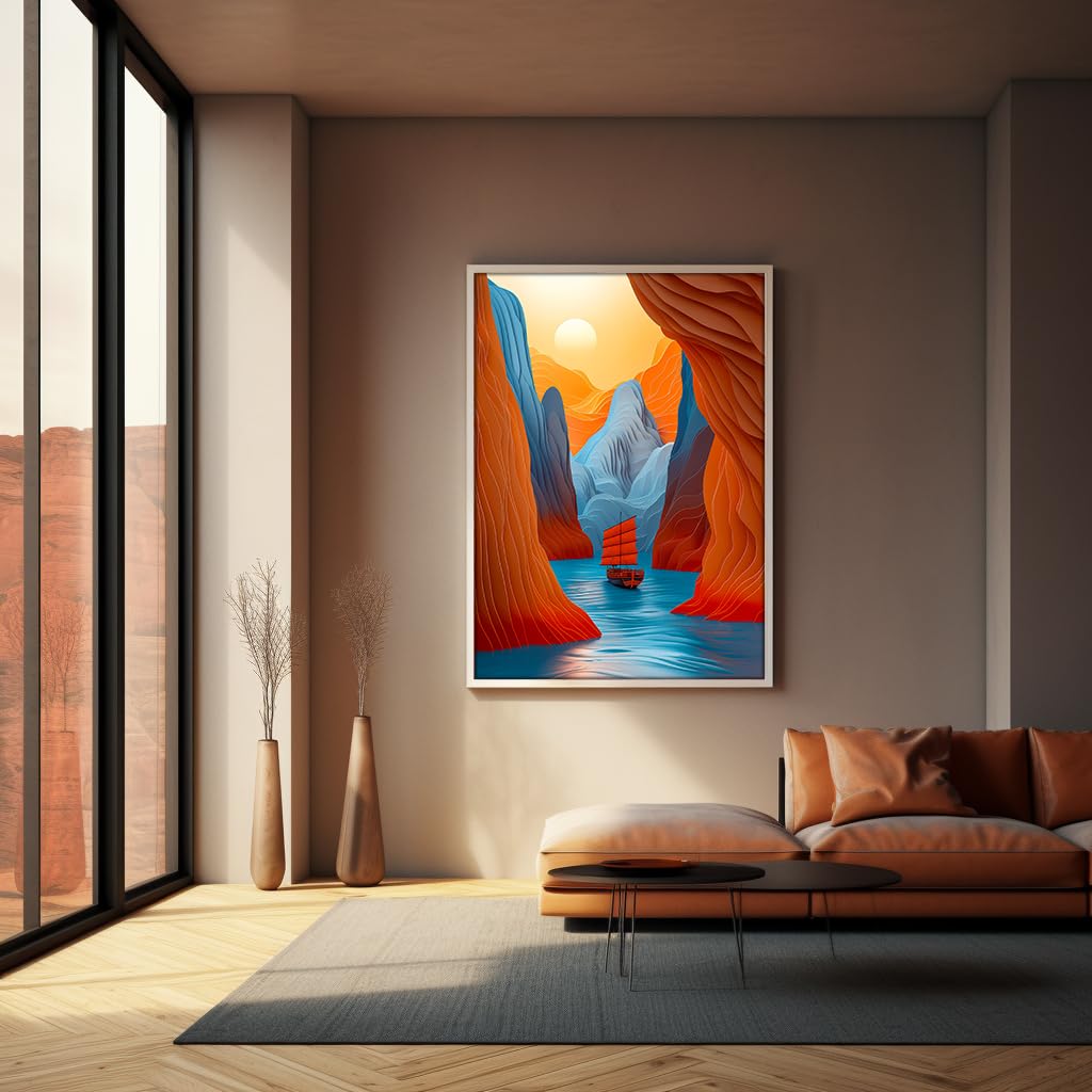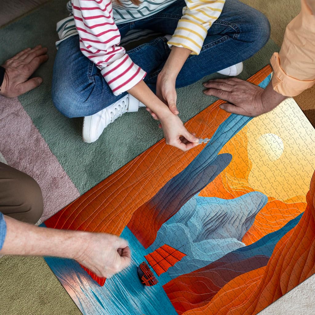 - This puzzle depicts a breathtaking scene of towering, layered rock formations in warm hues of orange and blue, with a serene lake and a sailboat in the foreground.Rendered in a distinctive, modern illustrative style, the image evokes a sense of wonder and tranquility.