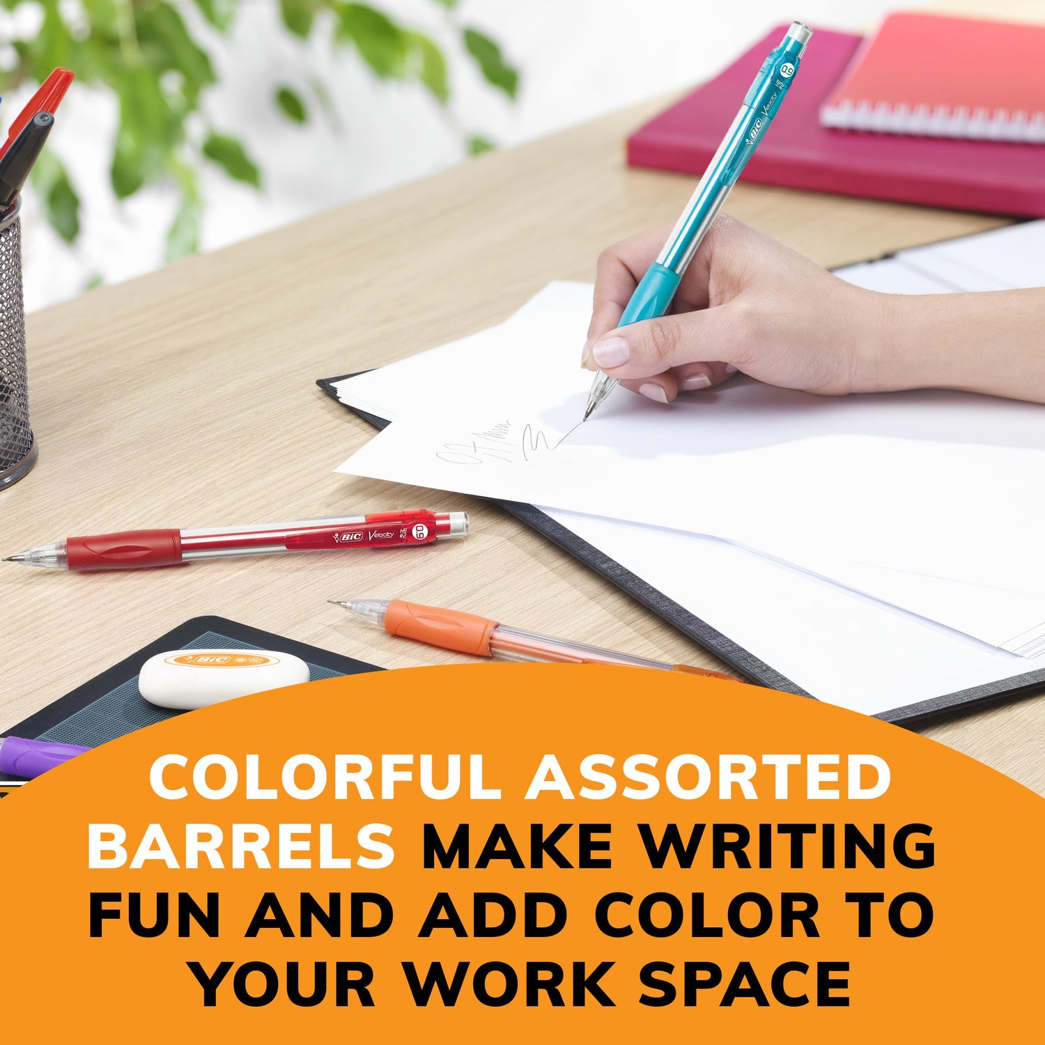 Details: Experience smooth, dark writing with BIC Velocity Strong Lead Mechanical Pencils with Erasers. These 0.9mm mechanical pencils have a thick point that’s ideal for a variety of everyday writing activities. The strong lead doesn’t smudge and erases cleanly, so your work looks neat and professional. Convenient and reliable, BIC Velocity Number 2 Mechanical Pencils 0.9 mm are always ready and never need sharpening; to advance the pencil lead, simply click the built-in eraser. These BIC pencils have a sophisticated, modern look, and their colorful clips easily attach to pockets, notebooks and more. The No. 1 selling mechanical pencil brand in the United States*, BIC offers dependable performance and value that you can trust. Looking for larger quantities of school or office supplies? Choose BIC Mechanical Pencils With Erasers for a high-quality, safe and affordable product you can trust. *Source: The NPD Group/Retail Tracking Service and Commercial Tracking Service, U.S., based on actual unit sales, 12ME June 2022 combined.