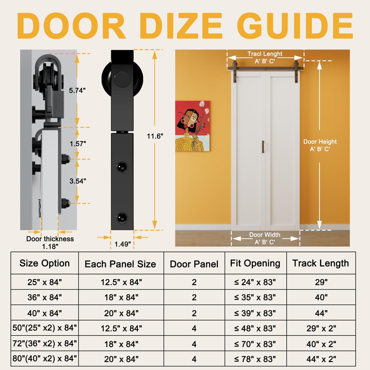 - โน๏ธ๐๐๐ฒ ๐๐๐๐ฌ๐ฎ๐ซ๐๐ฆ๐๐ง๐ญ๐ฌ: Bi fold barn door thickness 1-1/6", track length 44", door width 40" (Double 20"), door height 84", fit the door opening up to 39"W x 83"H, minimum ceiling clearance height 92". For the aesthetics, we recommend that the door opening is slightly smaller than the size of the door panel. ๐๐ฅ๐๐๐ฌ๐ ๐๐๐ซ๐๐๐ฎ๐ฅ๐ฅ๐ฒ ๐๐ก๐๐๐ค ๐ญ๐ก๐ ๐๐๐ญ๐ ๐๐๐๐จ๐ซ๐ ๐ฆ๐๐ค๐ข๐ง๐ ๐ ๐ฉ๐ฎ๐ซ๐๐ก๐๐ฌ๐ ๐ญ๐จ ๐ซ๐๐๐ฎ๐๐ ๐ฌ๐ข๐ณ๐ ๐ข๐ฌ๐ฌ๐ฎ๐๐ฌ.