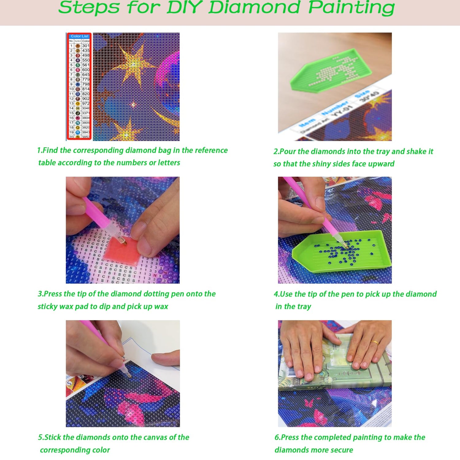 - 【How Does It Work】1. Peel back a portion of the plastic wrap on the canvas to begin placing the diamonds. 2. Dip the diamond pen into the wax pad, then use it to pick up and place the diamonds onto the corresponding numbered spots on the canvas. 3. Continue this process until the entire image is covered in sparkling diamonds!