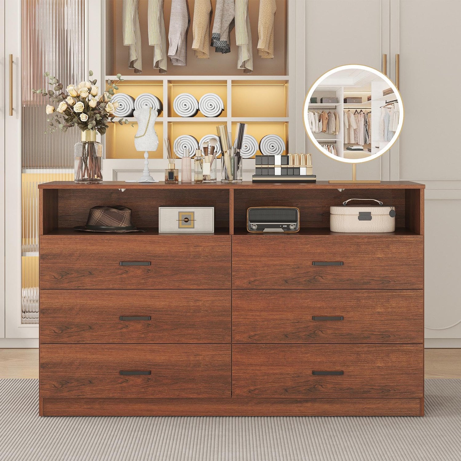 Bigbiglife 6 Drawers Dresser for Bedroom Wooden Drawer with Open Storage Cubby, Double Wide Dresser Organizer for Bedroom, Living Room, Entryway, Hallway (Walnut Brown)