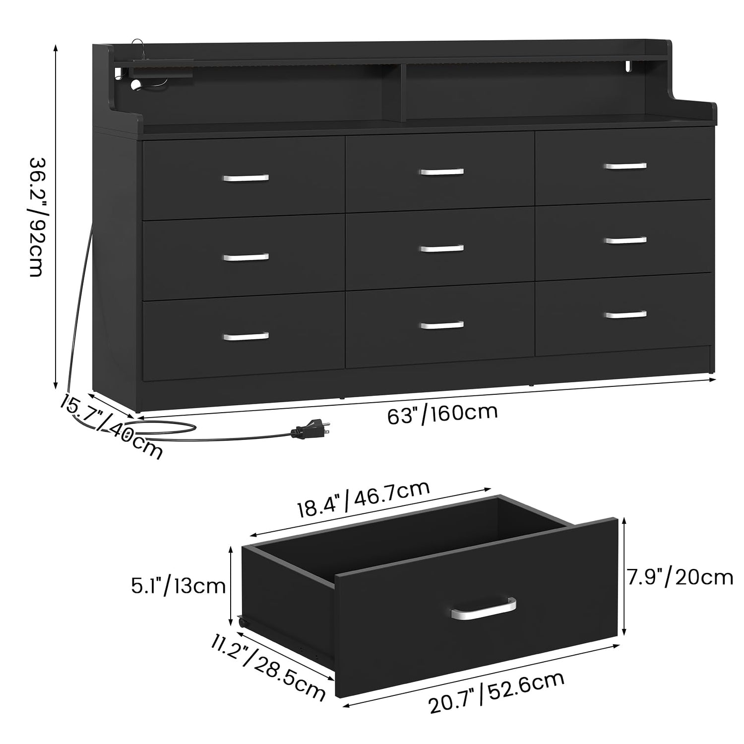 Bigbiglife 9 Drawer Dresser with Built in Power Outlet and LED Light, Modern Chest of Drawers for Bedroom, Triple Wide Drawer Organizer Cabinet for Living Room, Entryway, Hallway, Black