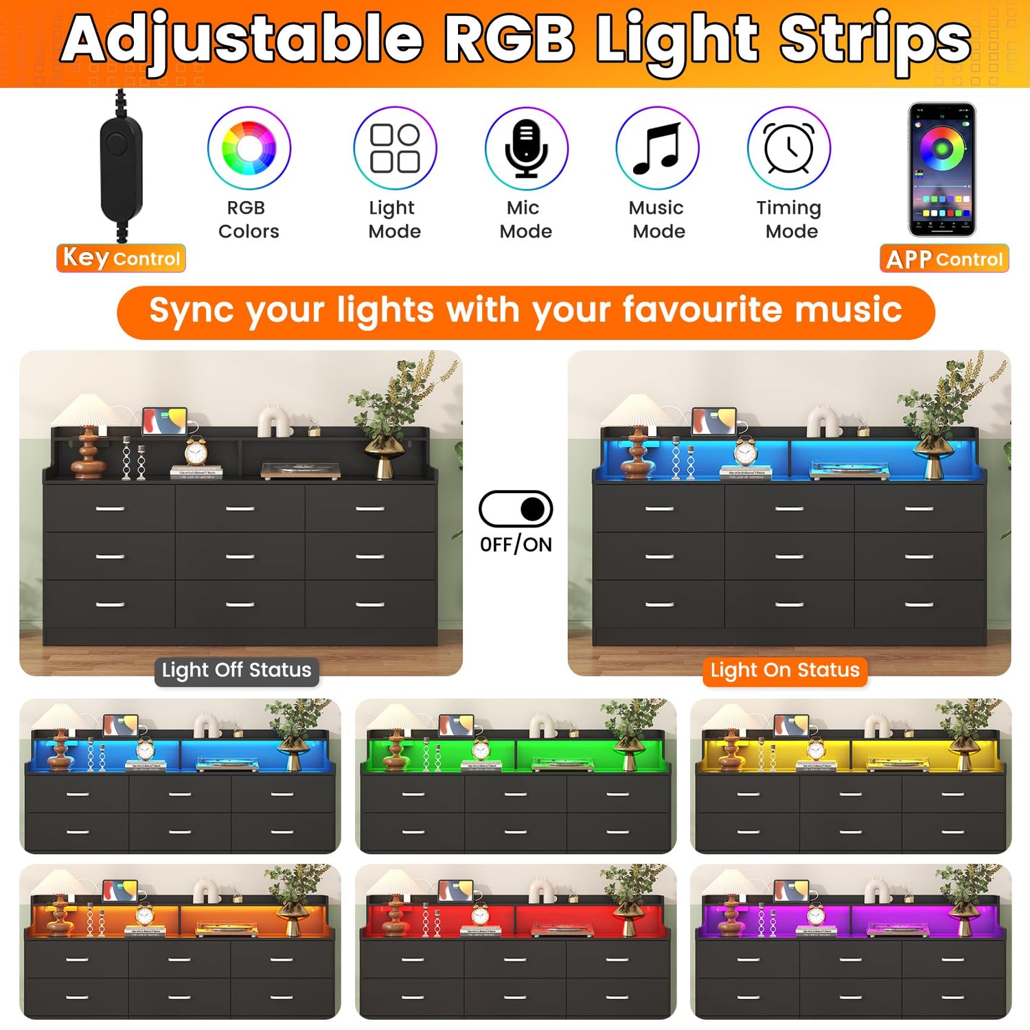 - Black Dresser with LED Lights: This elegant drawer organizer features customizable multi-color RGB LED light strips, allowing you to effortlessly adjust hues and brightness via touch controls or a dedicated app. Seamlessly blending functionality with modern aesthetics, it transforms your furniture into a dynamic, stylish centerpiece.