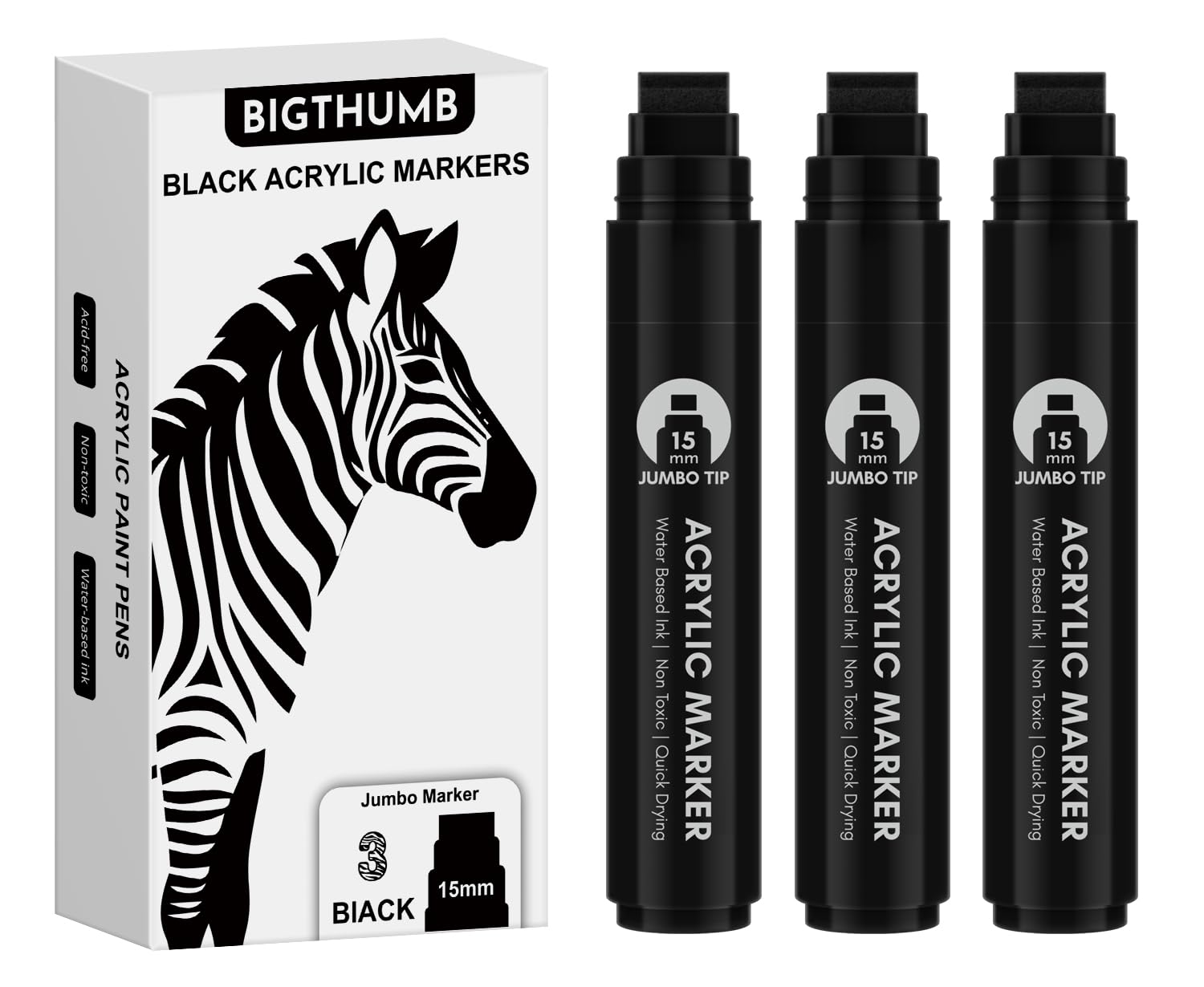 BIGTHUMB 3 Pcs Black Jumbo Permanent Markers: 15mm Wide Tip Thick Acrylic Paint Pen Large Calligraphy Marker for Rock Painting, Poster, Sign, Canvas, Glass, Wood, Ceramic