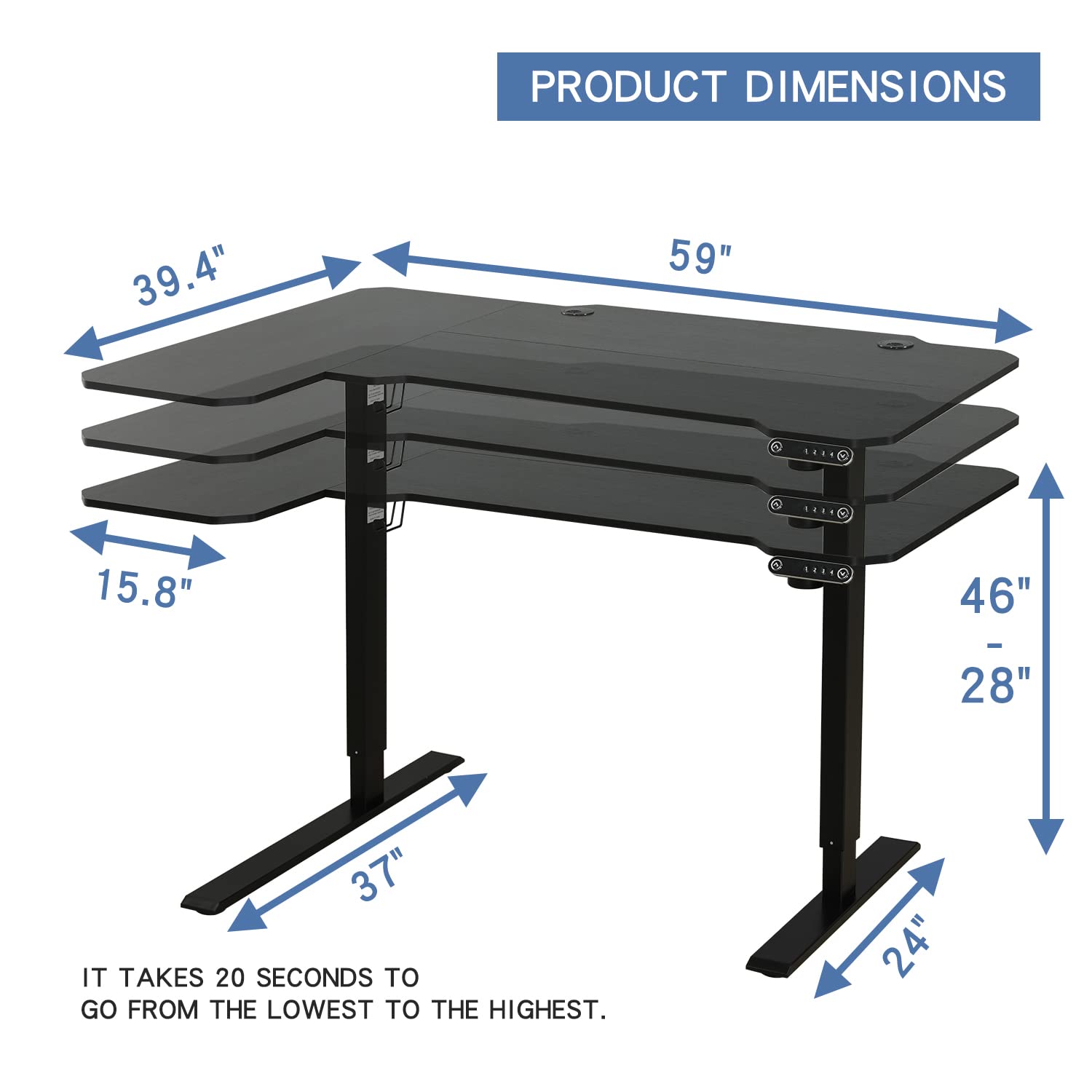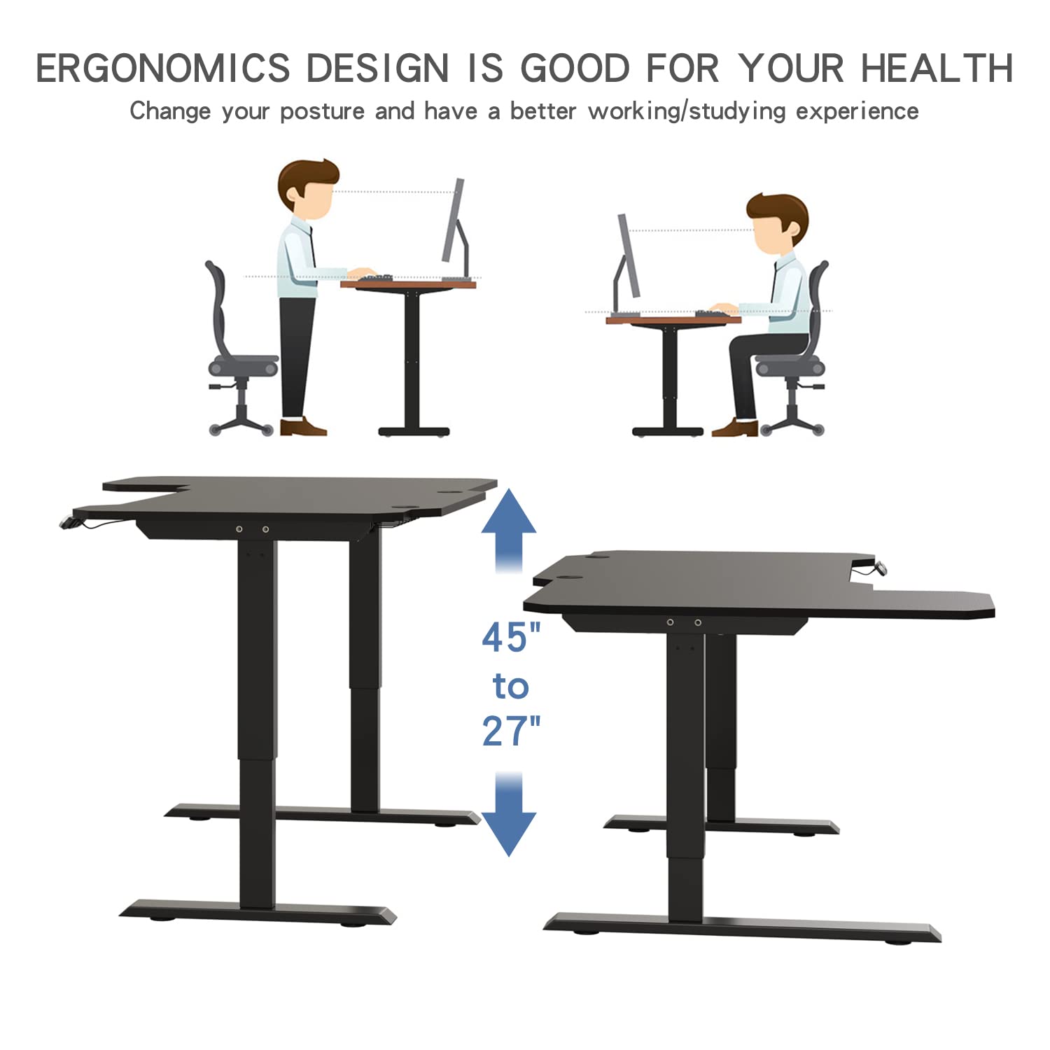 - Motorized Adjustable Lift System: Transition smoothly and noiselessly between sitting and standing at the press of a button. The motor lift mechanism offers electric height adjustments from 28” to 46” so you can stay active while working.