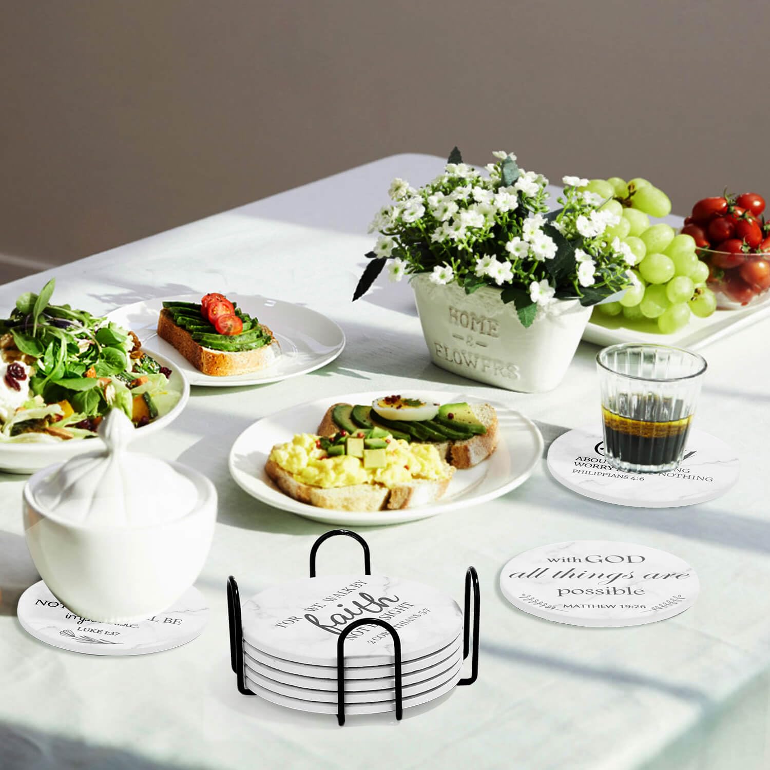 - Package including: Billbotk drink coasters set includes 8 pieces of ceramic coasters and a metal holder. Simple marble design with Bible Verses is suitable for home, office and patio table decorations. The metal holder makes the coasters convenient for storage.