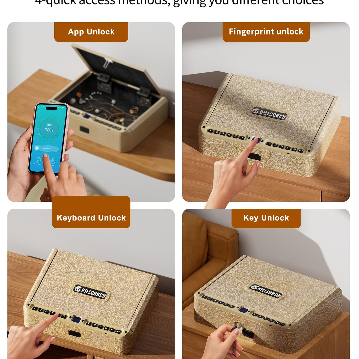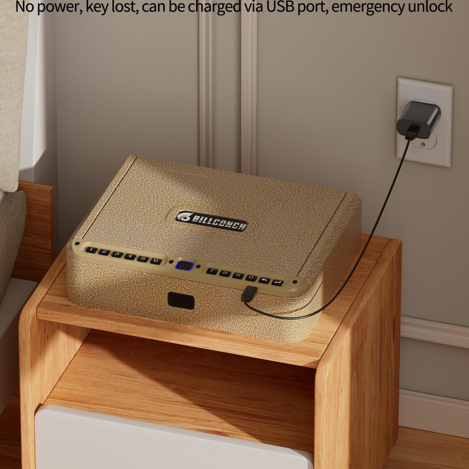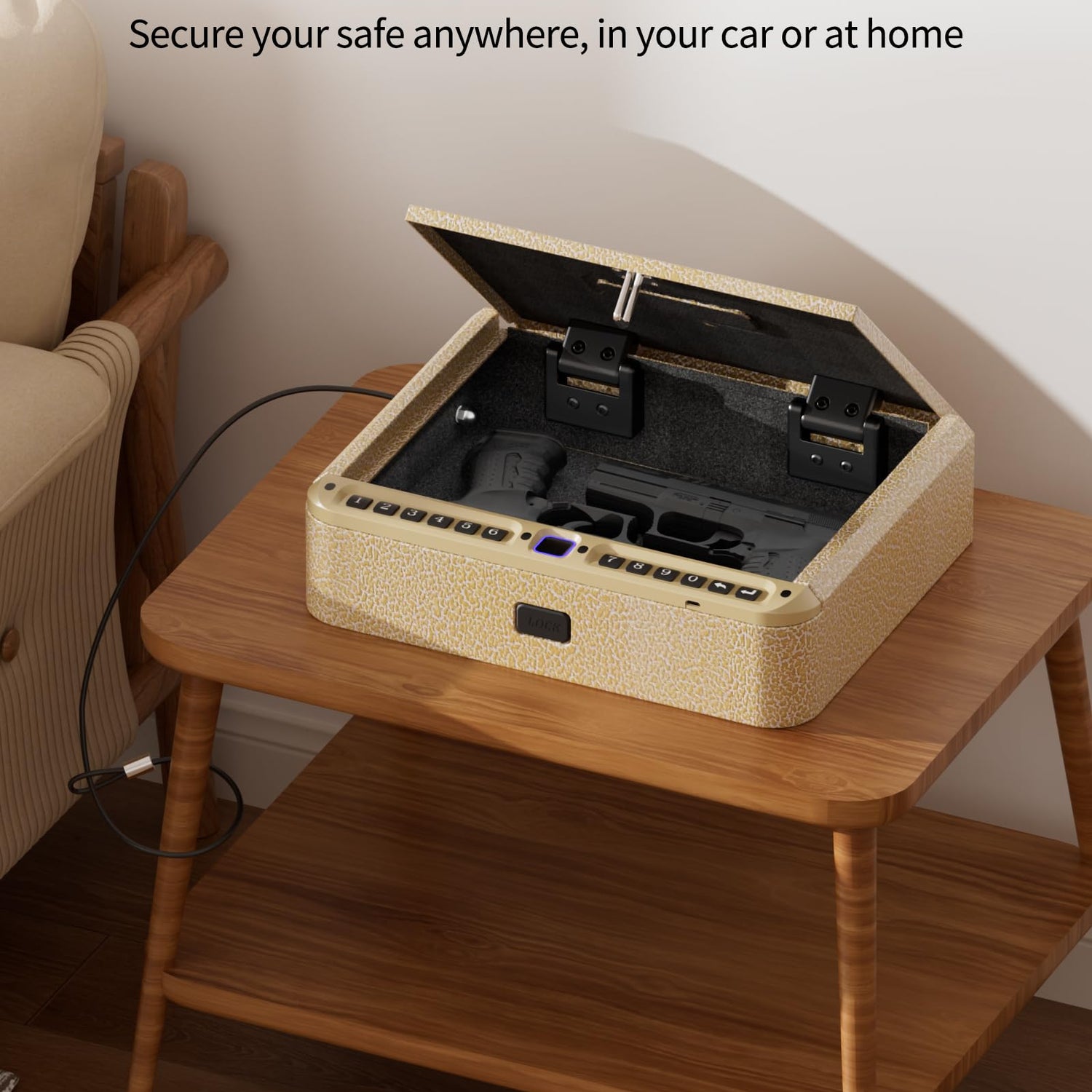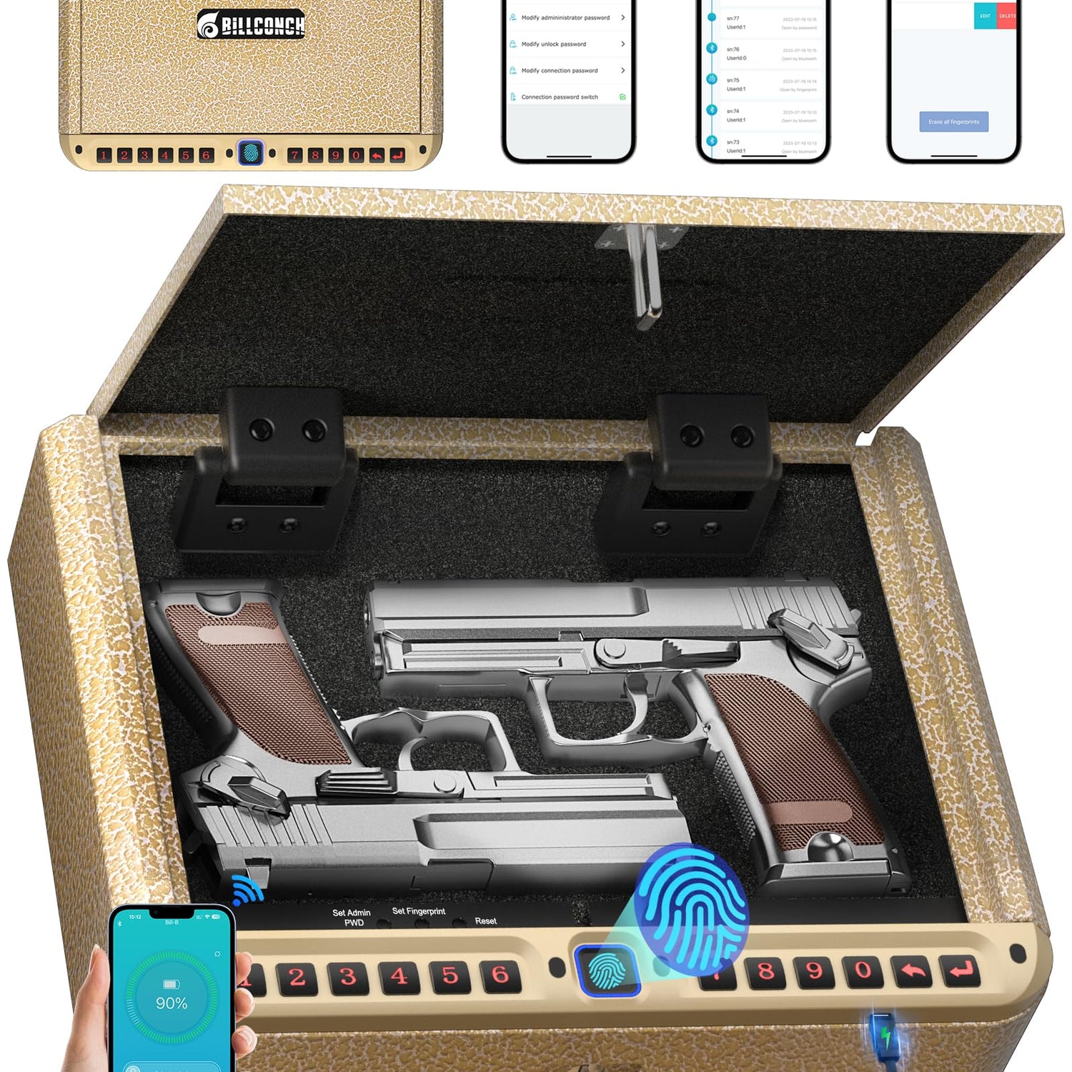 BILLCONCH Gun Safe for Handgun - Biometric Pistol Safe 4 Ways Quick Access with Fingerprint/Full-digital Keypad/Key/APP Lock and Security Cable for Nightstand Bedside Home - Limited Gold