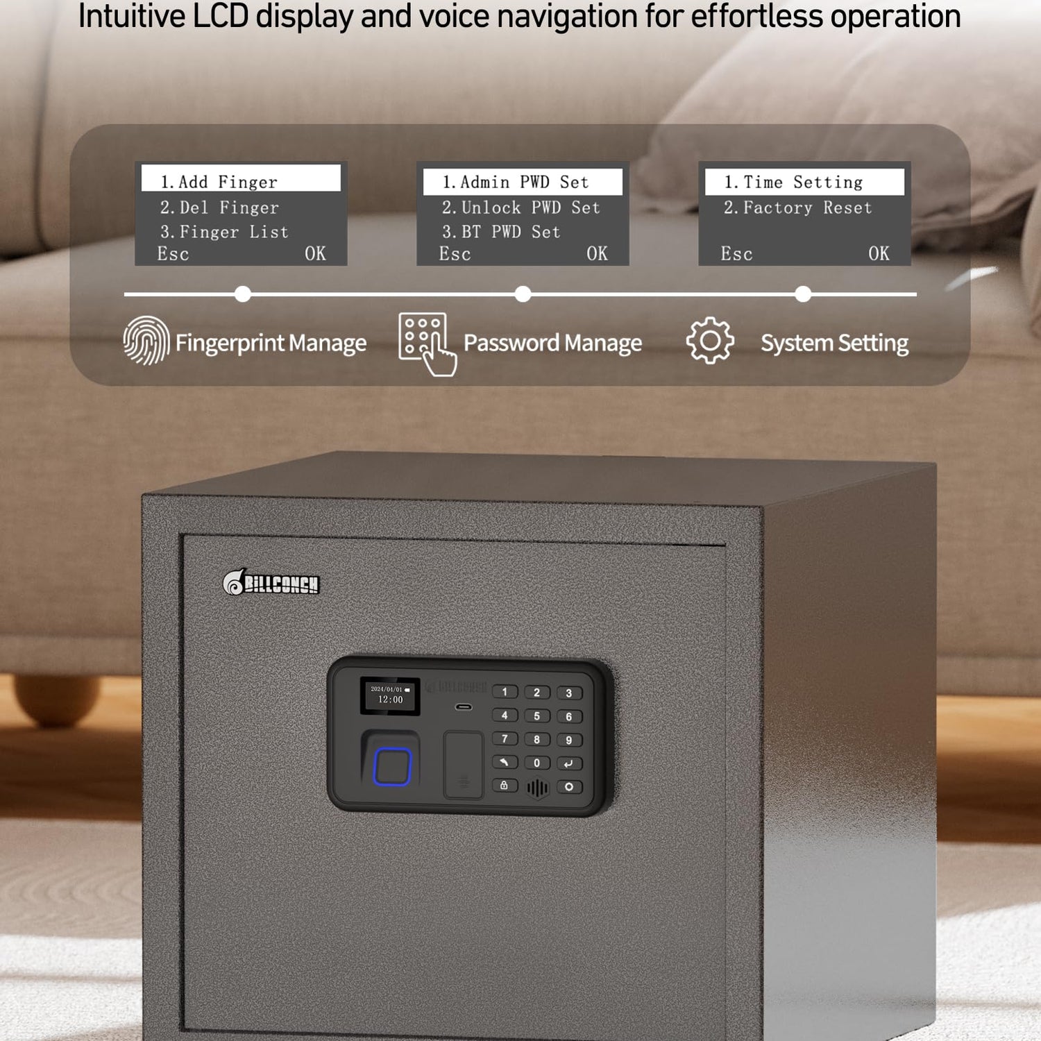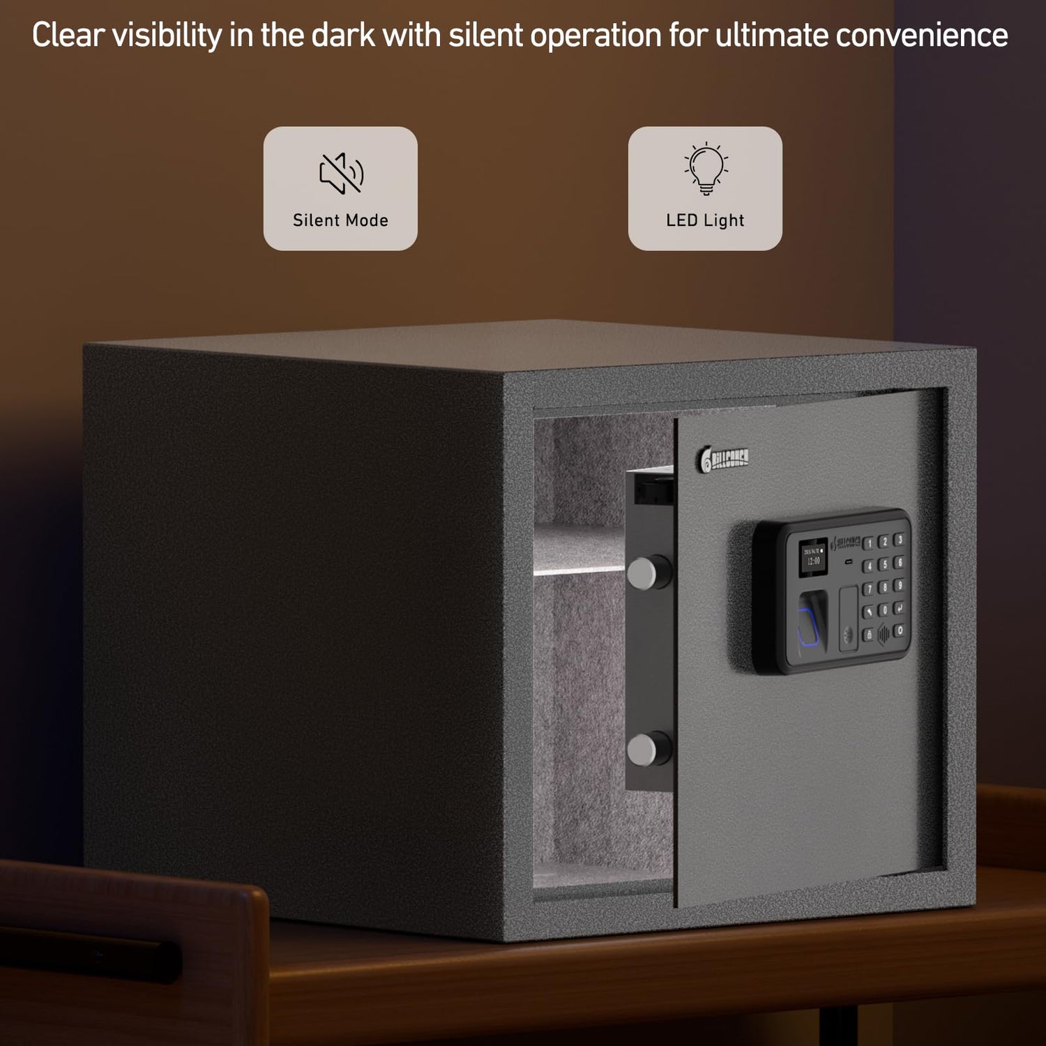 - Additional Features: The pistol safe includes an LCD screen with a smart UI and voice guidance for easy setup and use. You can switch to silent mode if preferred. Built-in automatic LED lighting ensures easy access to valuables in the dark, allowing for quick retrieval in emergencies