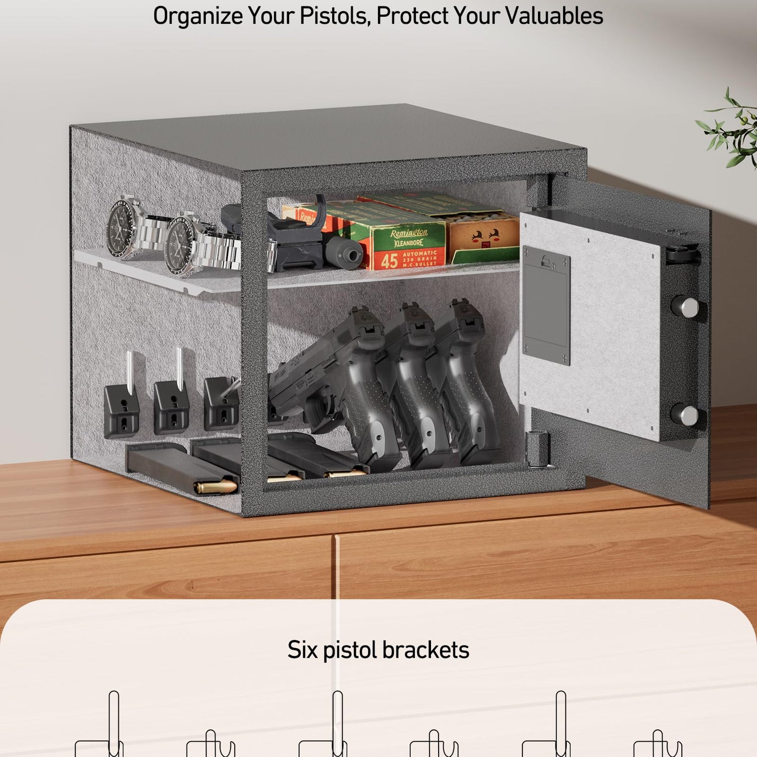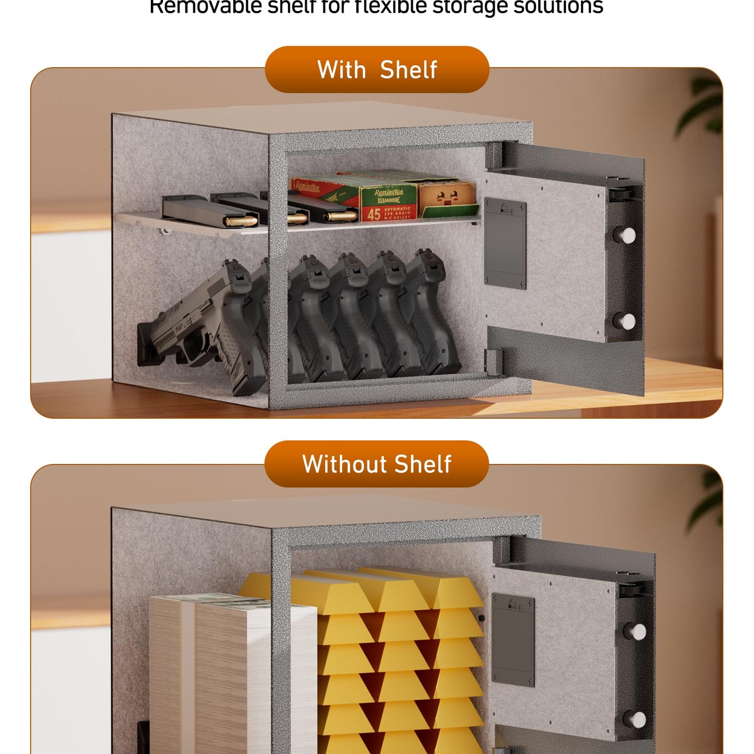 - Larger Storage Space With Removeable Shelf: The large space design can safely accommodate 6 pistols, passports, cash and other vaulables. It includes a removable shelf for efficient space usage