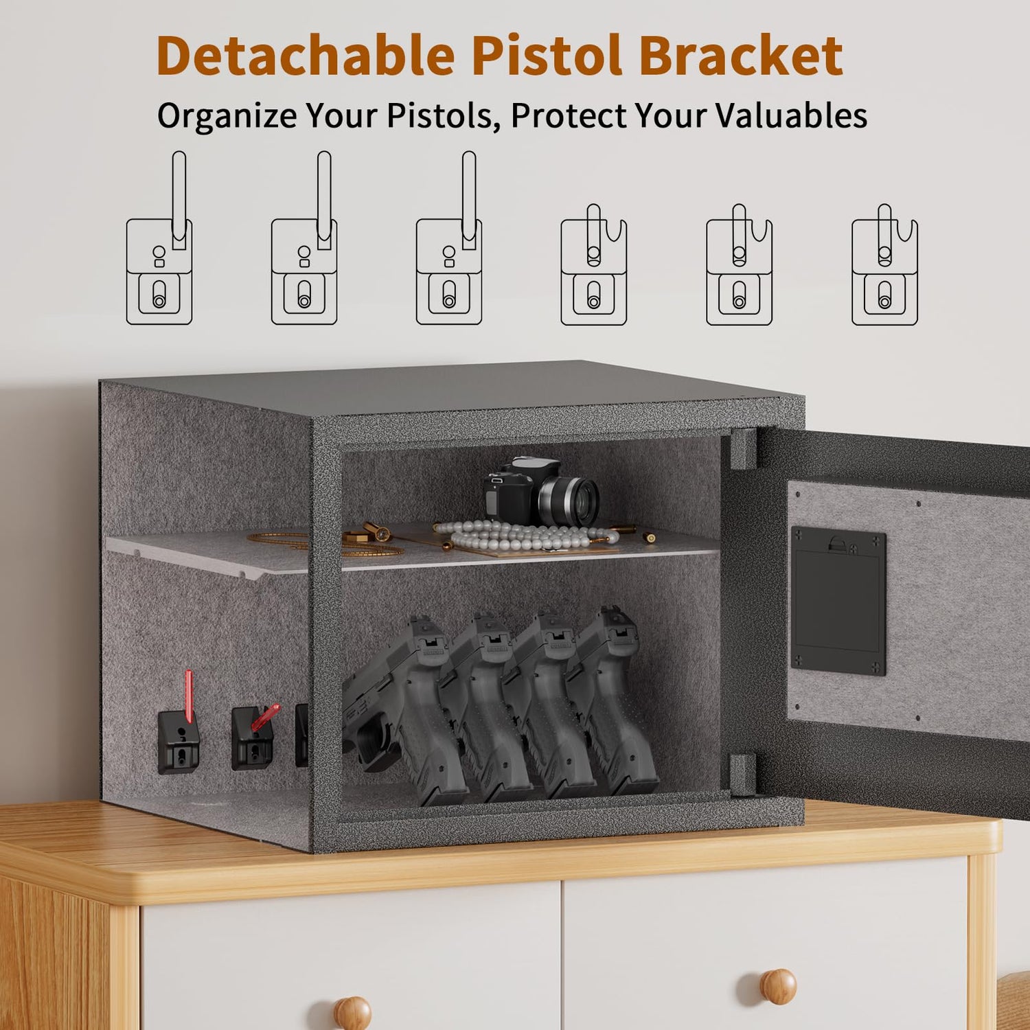 - Unique Pistol Bracket Design: This fingerprint gun safe can easily store 6 pistols and other precious items. You can scientifically and safely to store your pistols, protect your children,The support bar which holds guns can be unscrewed and put to the hole at the side of the pistol bracket base to save space