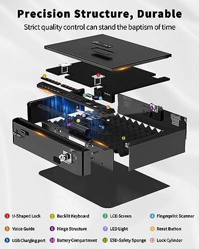 - Intelligent Design, Convenient Life: The handgun safe has a smart LCD with Ul that simplifies the setup process with intuitive voice navigation so you can easily set up and operate without the need for annoying manuals. It also has a mute function humanized design, you can also switch to mute mode according to your preference. Gun safe with a 2200mAh large capacity rechargeable battery and low power consumption chip, with USB charging and low battery reminder, you can have worry-free power