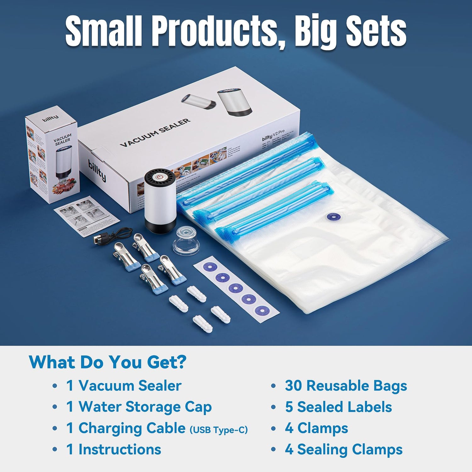 - Small Products Big Sets: This is a big set with 47 items, and you can get all of them with the purchase of one vacuum sealer for food - 30 sous vide bags, 5 sealed labels, 4 clamps, 4 sealing clamps, 1 vacuum sealer, 1 water storage cap, 1 charging cable and 1 instructions. What a great value for money