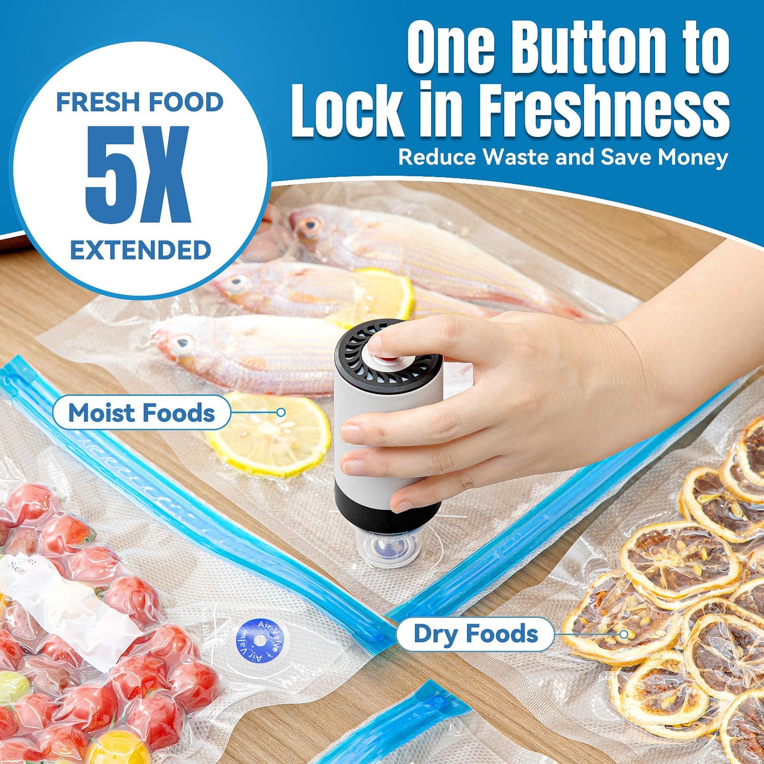 - One Button to Lock in Freshness: The high-quality food vacuum sealer is very easy to use and can extend the freshness of your food up to 5 times, can cut down on waste and save on money. You can rapidly maintain the freshness of any food, dry and moist, etc., and you can explore your culinary originality regardless of the location