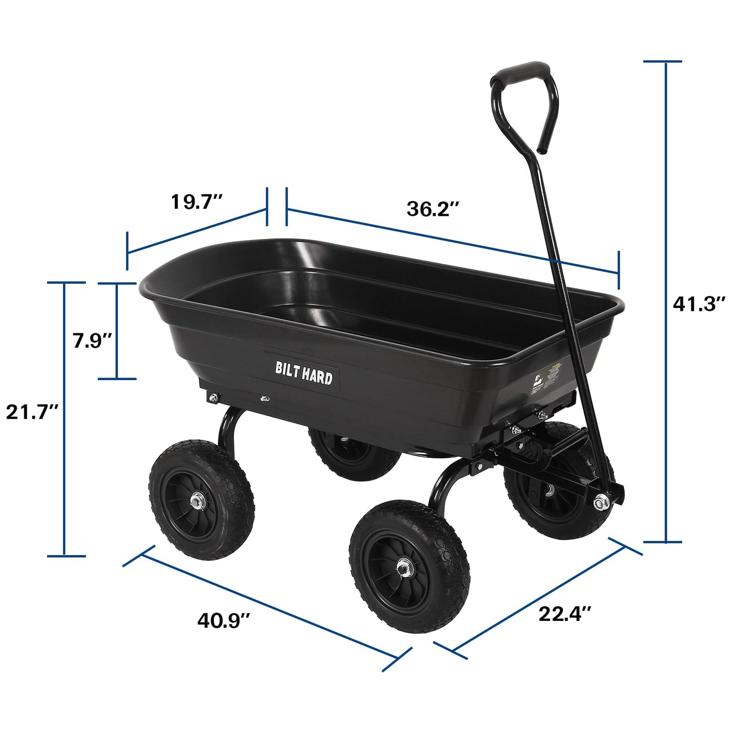 - CUSTOMER SATISFACTION GUARANTEED: BILT HARD are committed to providing our customers with high-quality products and exceptional customer service. We stand behind our Poly Garden Dump Cart and are confident that you'll love using it. If for any reason you're not satisfied with your purchase, we offer a 100% satisfaction guarantee, ensuring that you can shop with confidence.