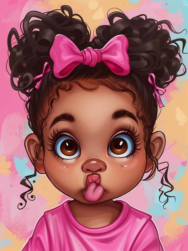 - The picture shows a cute cartoon girl with curly hair tied up in two buns with a pink bow. She has big, expressive eyes and is wearing a pink shirt. The background is colorful, giving a lively and cheerful atmosphere.