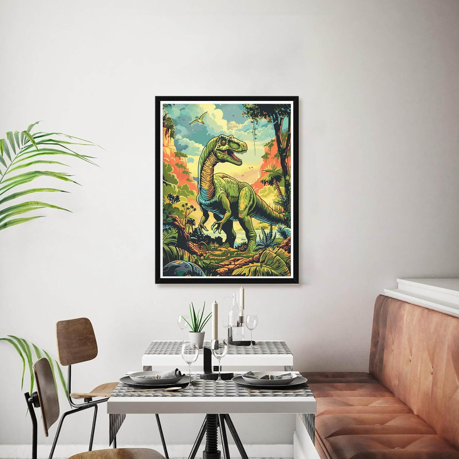 - In a vibrant and colorful prehistoric world, a majestic dinosaur stands tall amidst lush greenery and towering trees. The sky is filled with fluffy clouds, and a bird soars freely in the distance. This scene captures the essence of nature's beauty and the awe-inspiring presence of these ancient creatures.