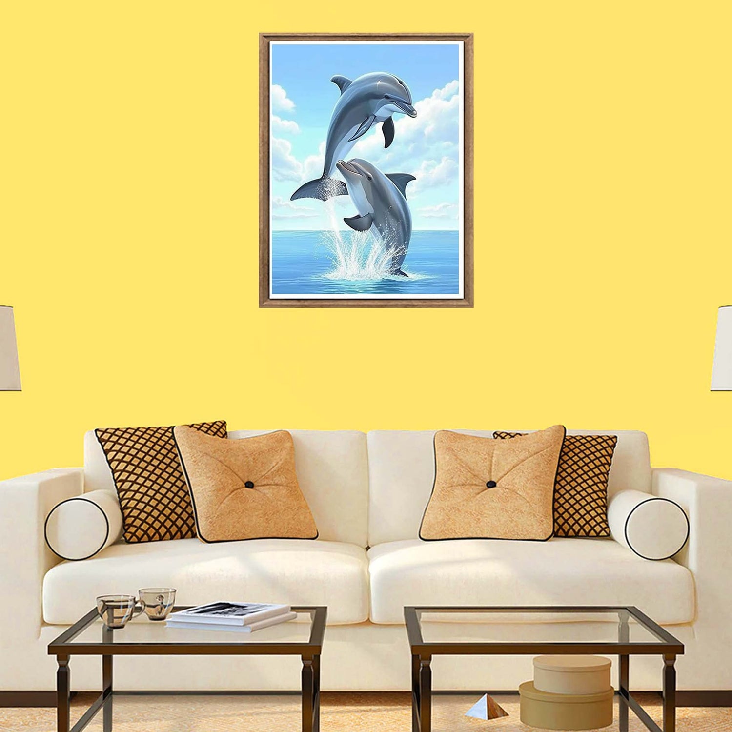 - Two dolphins leap joyfully from the ocean, their bodies arcing gracefully against a backdrop of blue sky and fluffy clouds. The scene captures a moment of pure freedom and harmony with nature, symbolizing the spirit of adventure and the beauty of the natural world.
