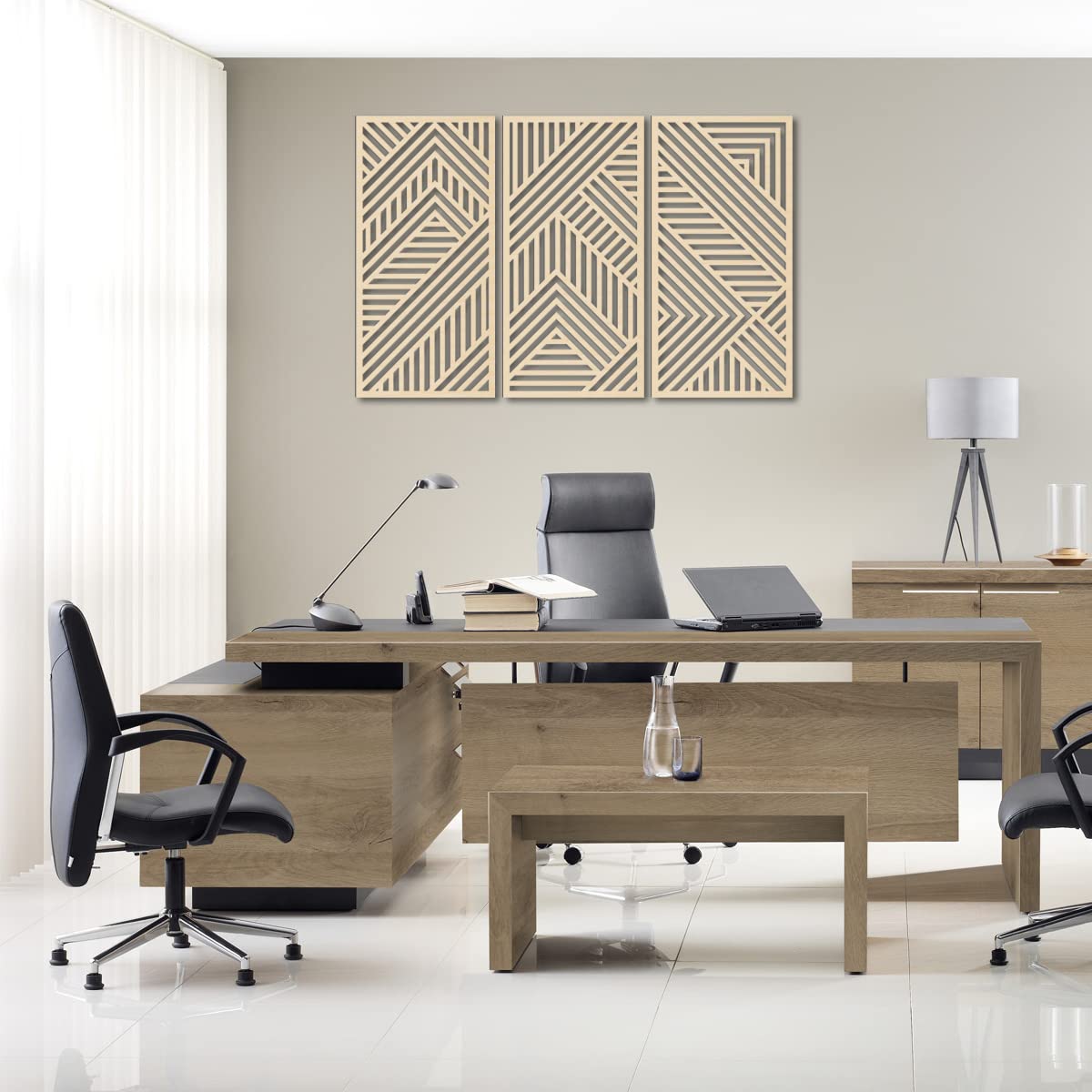 - GEOMETRY WOOD WALL ART HANGING DECOR: The design adopts 3D precision carving technology, matches the appearance of log color, and the hollow-out of regular geometric graphics, which conforms to the artistic aesthetic concept of modern home decoration. It is very atmospheric and elegant. Hanging it in the office and living room is a very beautiful scenery.