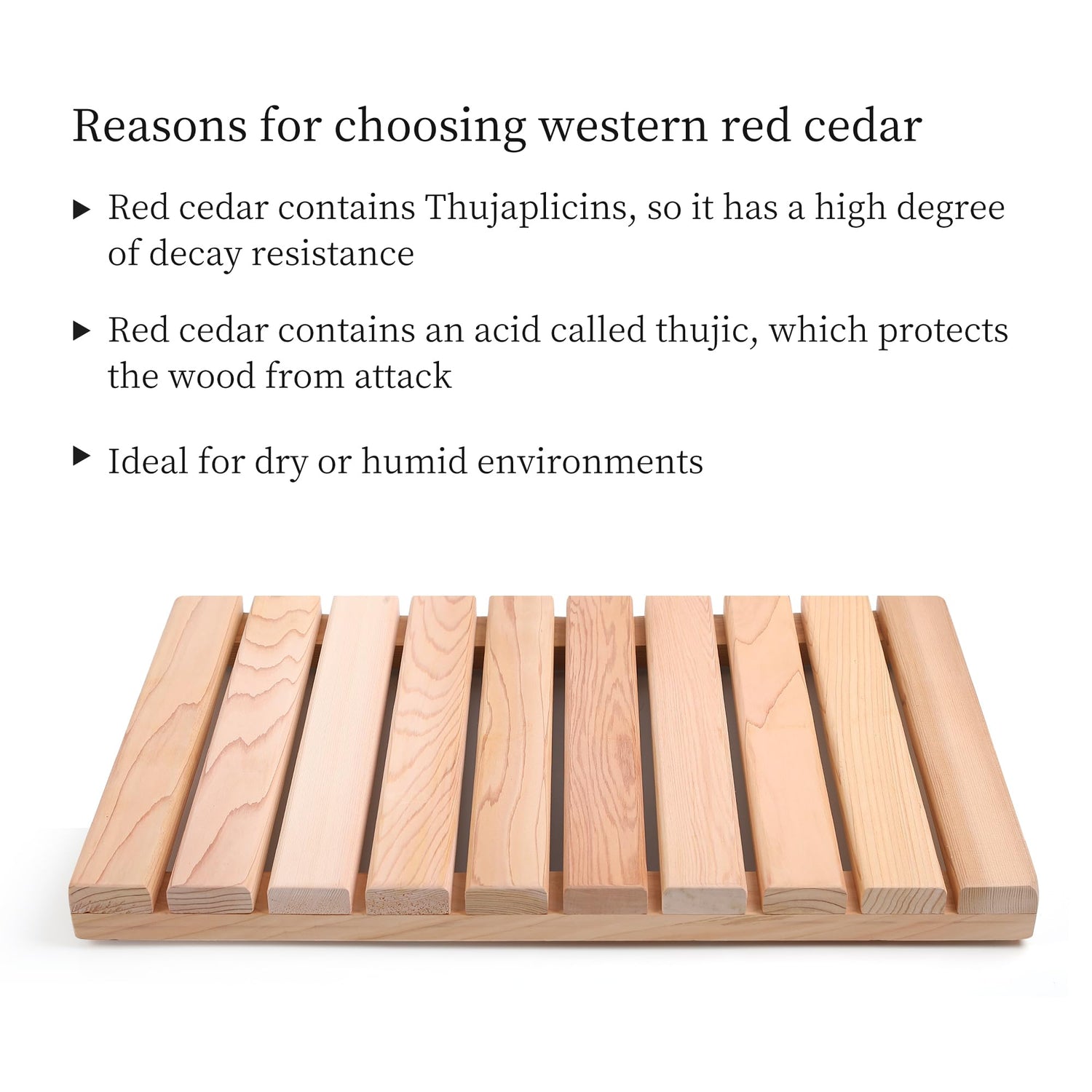 - Softness and Absorbent: Cedar is strong, but its softness creates a luxurious feel underfoot while teak shower mat and bamboo bath mat are harder on the feet, less of a sense of comfort. More critical, cedar has excellent moisture absorption and absorbs some of the water from your feet which helps in the drying process.