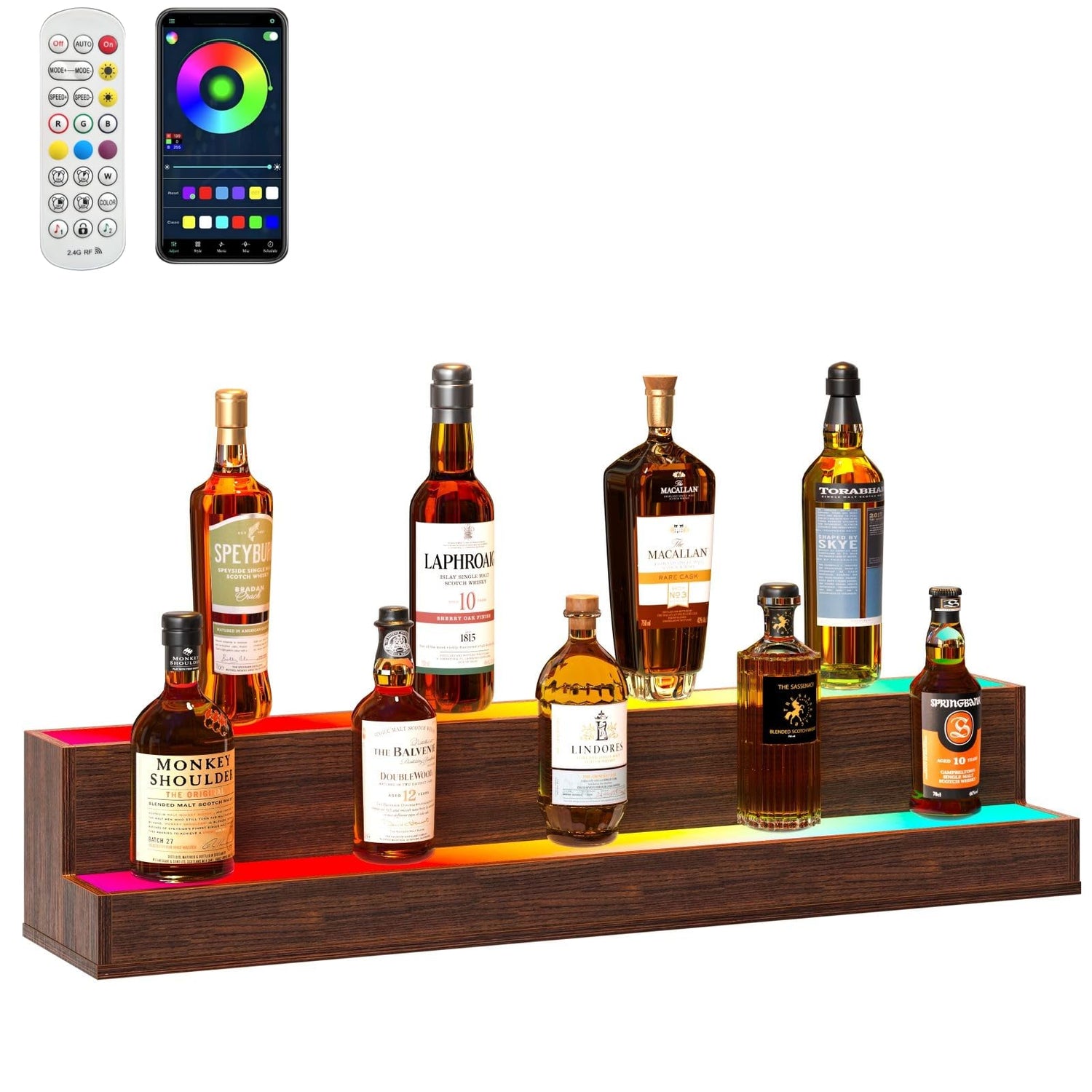 Bingoday LED Liquor Shelf with Acrylic Bottle Display Shelves Wood Rack Wine Retro Bar Cabinets for Home Commercial Bar Party (Walnut, 2 step-38in)