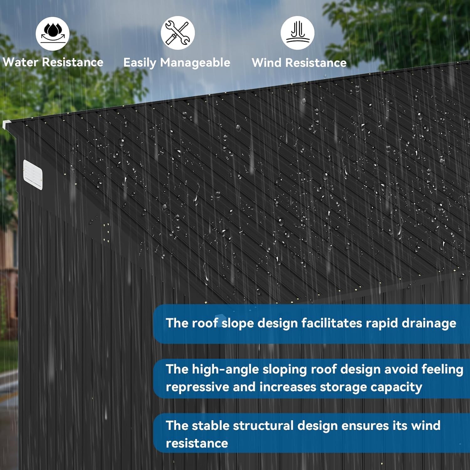 - Top Ventilation & Sloped Roof Design for Dryness: Equipped with a small ventilation opening at the top, the shed maintains air circulation, effectively preventing internal moisture and providing a dry and comfortable storage environment for your tools and items. The unique sloped roof design is not only aesthetically pleasing but also ensures rapid drainage during rainy days, preventing water accumulation
