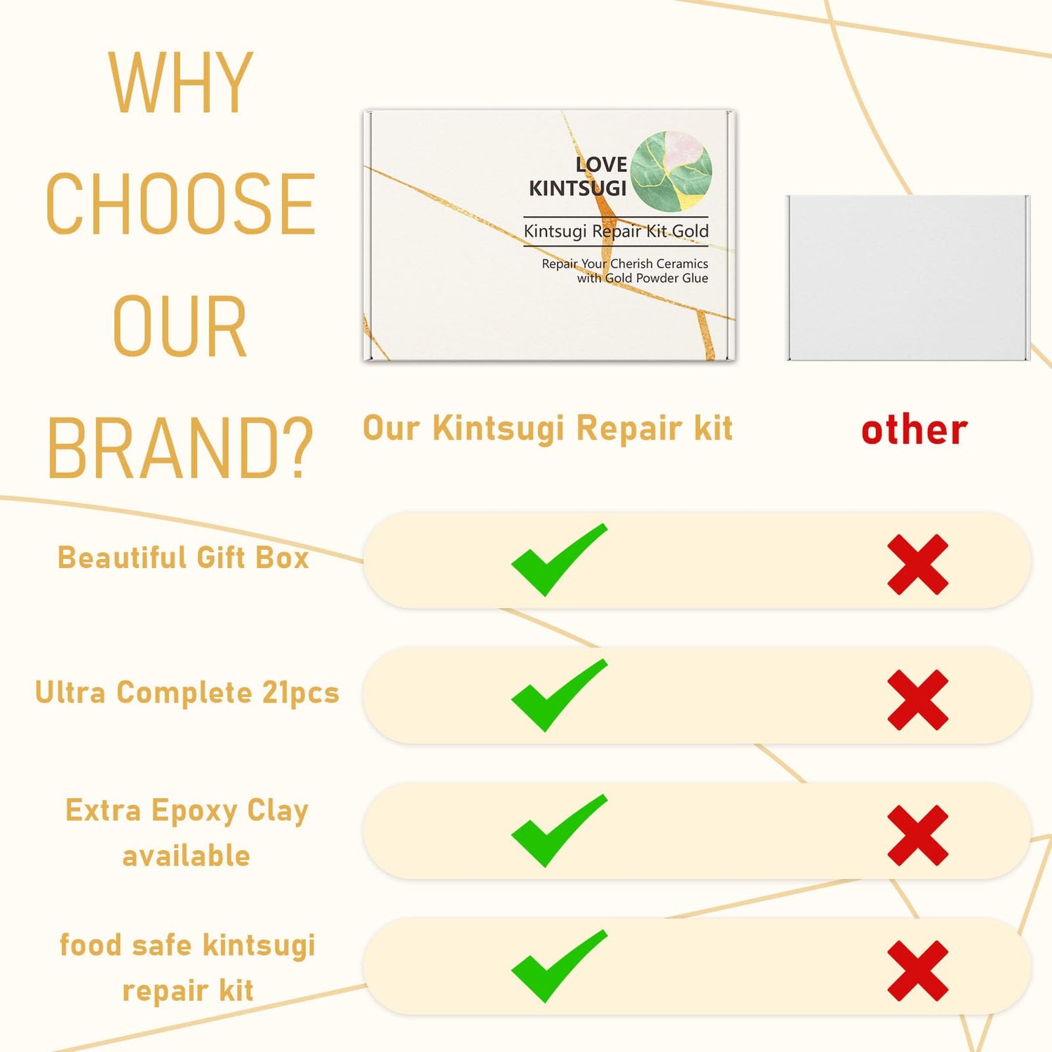 - Beautiful result: Our bio kintsugi repair kit will give you a beautiful result that you will love. You can create stunning golden cracks that highlight the history and beauty of your items. You can also make your items more unique and personal with your own kintsugi style.