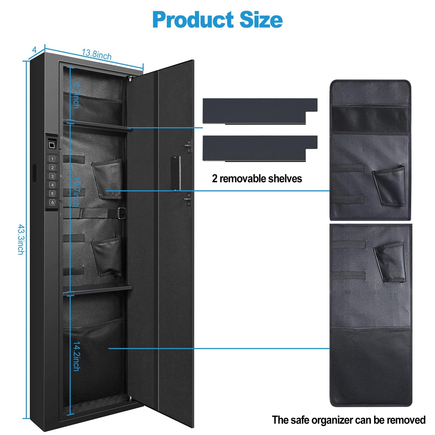 - ✅【Hidden RIfle / Shotgun Safe mounted on the wall or Placed horizontally on the floor】 It hold two max guns length of 43" with or without scopes. Slim Vertical Compact safe stores great behind the door, in a closet, on the wall or inconspicuously in a vehicle. The included removable shelves allow multiple storage configurations depending on desired preferences.