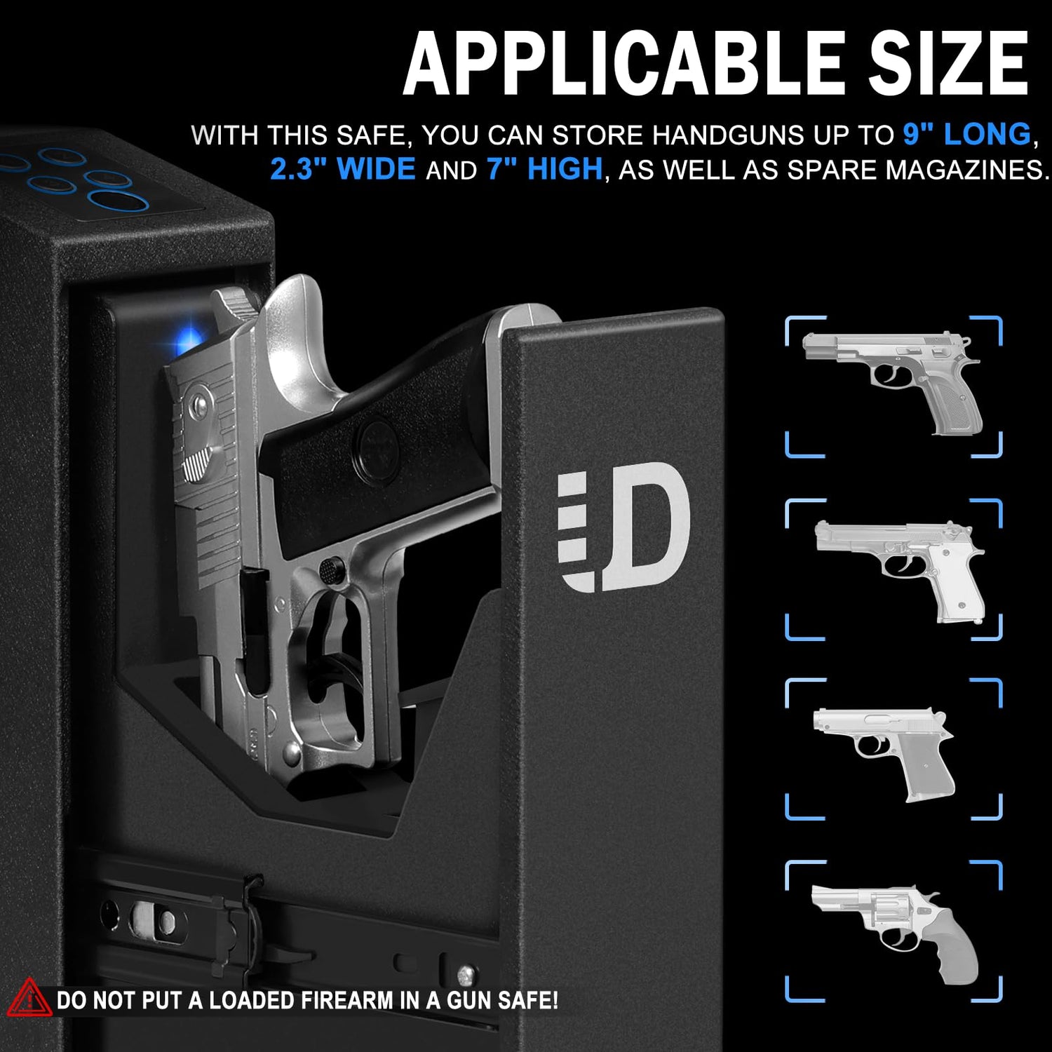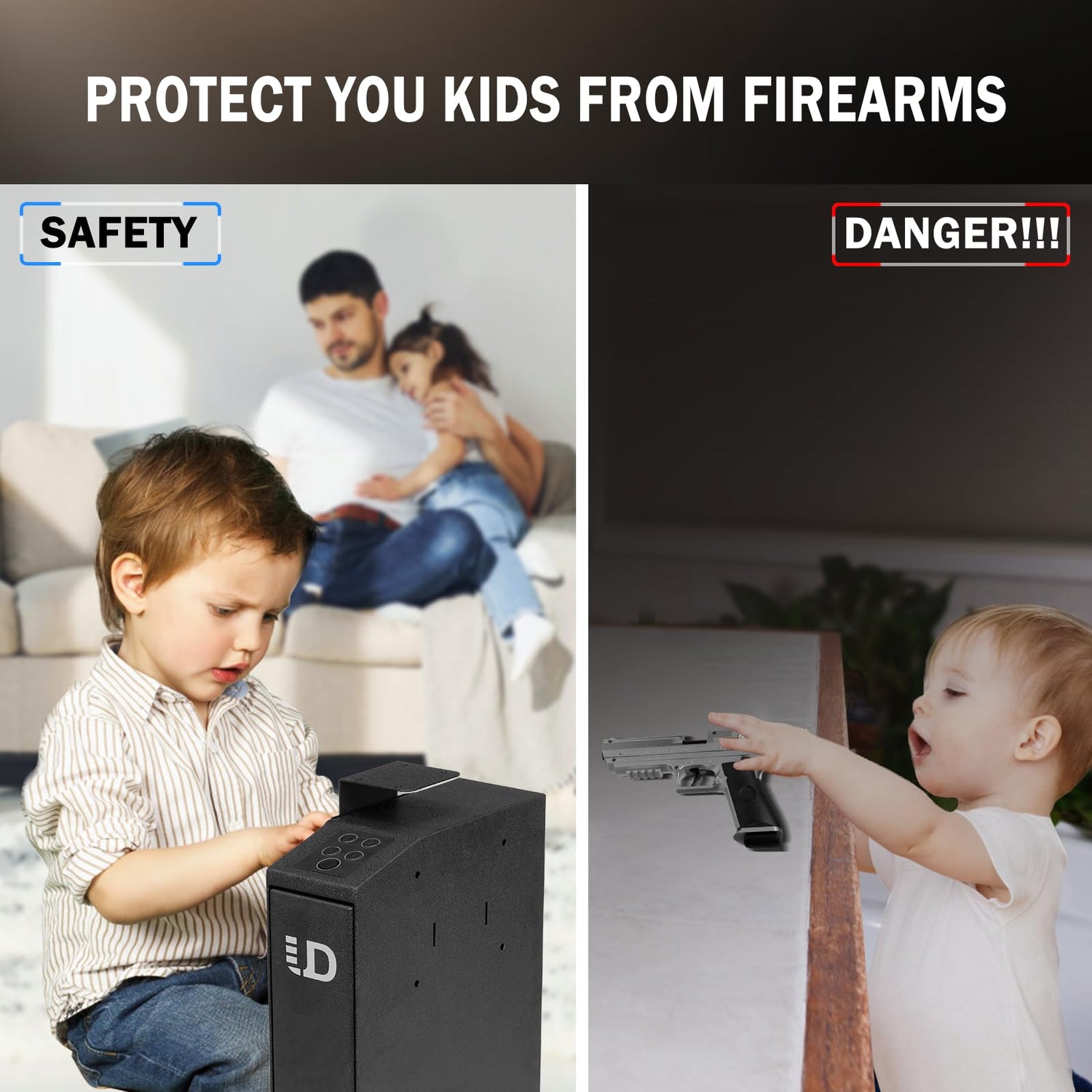 - 【Home Gun Safe】Quick access biometric gun safe is absolutely essential for a family. If you have young children who don't fully understand the potential danger of firearms, placing guns in a gun lock box is a responsible way to ensure their safety. The handgun safe can also keep your valuable items out of reach when there is no supervision. Gun safe slim vertical design allows for discreet storage options, weather under a desk, nightstand, mounted on the wall, on the floor, on a bookshelf or inconspicuously in a vehicle