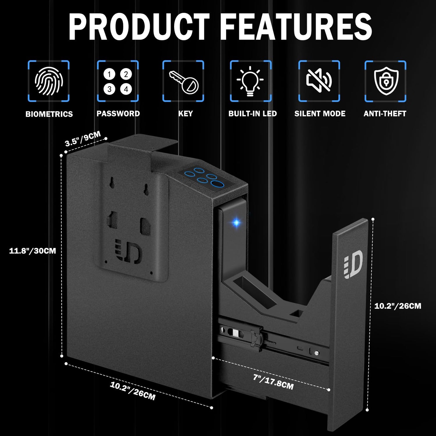 - 【Multifunctional Gun Safe】The gun safe is equipped with backlit keys and internal lighting. Even in low-light conditions, it ensures smooth and hassle-free opening of the case. The handgun safe has a mute function, which can prevent the leakage of your location in emergency situations.The biometric gun safe for handgun is equipped with anti-theft screws. (Installed on the bracket from inside the product)