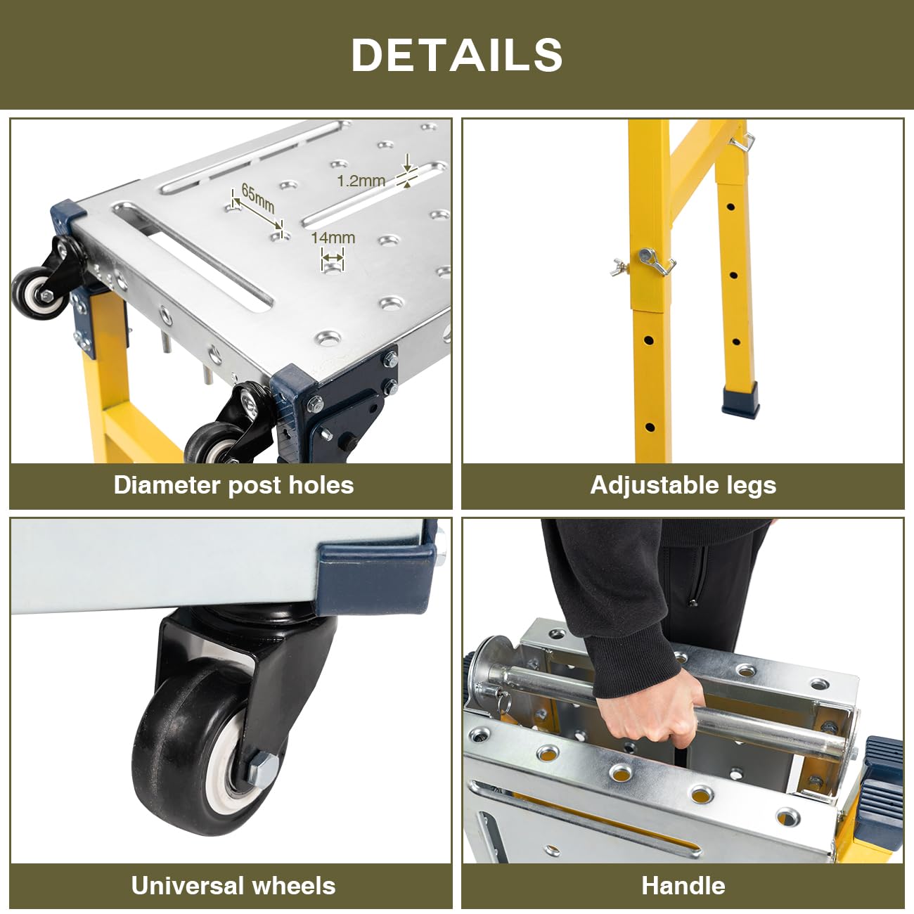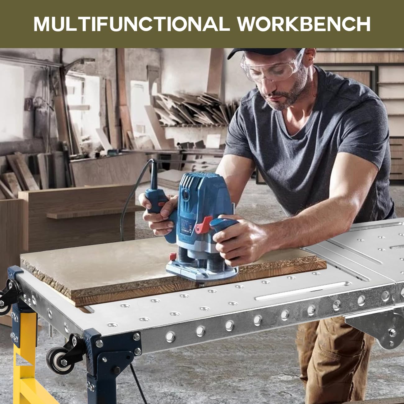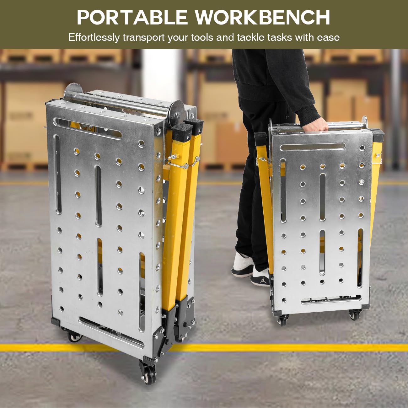 - Product Dimensions: The portable workbench is 56 inches long, 14 inches wide, 43 inches high and weighs 41.8 pounds. It's made of alloy steel and can hold up to 1,100 pounds. Our product serves as both a portable workbench and a welding table. It is designed for versatility, allowing you to carry it with ease and perform various tasks at any given time.