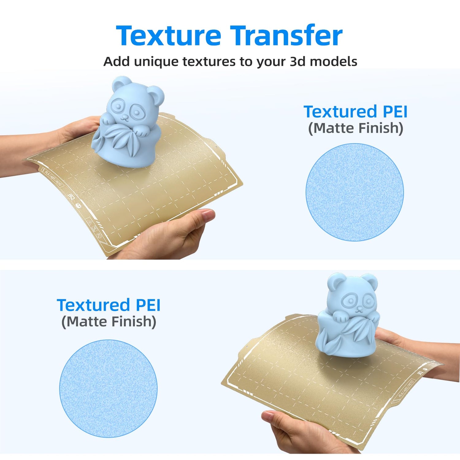 - Double Sided Textured PEI Printing: The product is flexible spring steel plate with double sided textured PEI coating. The dual sided PEI frosted surface, presenting the frosted sticker surface a distinctive frosted touch, provides greater adherence to the model and prints without warping